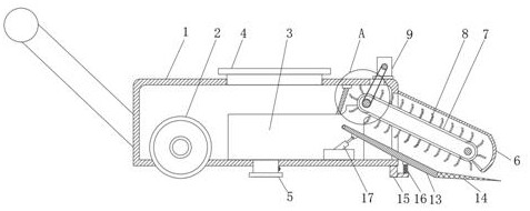 本实用新型涉及黑猪养殖技术领域,公开了一种淮南黑猪养殖粪便清理装置,包括手推车、轮体和粪便收集箱,所述轮体安装在手推车的前后两侧外壁上,所述粪便收集箱固定安装在手推车的车内,所述粪便收集箱的底部内壁固定安装有排出管,所述排出管的底端贯穿手推车的底板延伸至外侧,且排出管的外壁上安装有开合阀,本实用新型整体结构设置合理,操作便捷,推动手推车的同时,通过铲板的安装,可以实现对圈舍里粪便的铲除工作,避免了人工处理收集的工作,提高了粪便清理效率,劳动强度大大降低,有利于大规模的清洁,利于专业户清理圈舍里的粪便,且可以对生猪的粪便进行收集,保护了环境。