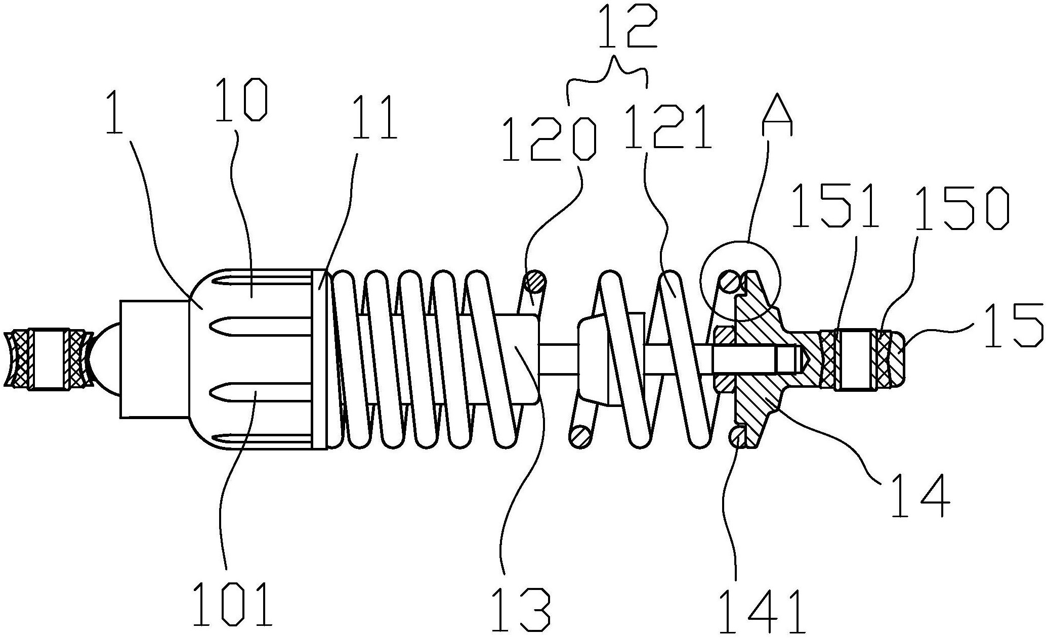 本实用新型公开了一种用于摩托车的减震器,旨在提供一种减震缓冲效果好,减震弹簧的结构强度高,连接稳定性好的用于摩托车的减震器,其技术方案要点是铝托架上设有用于增加对于减震弹簧缓冲效果的第一缓冲区和第二缓冲区,第一缓冲区包括第一传导部、缓冲部和第二传导部,缓冲部置于第一传导部和第二传导部之间,第一传导部和第二传导部均与铝托架相互连接,缓冲部与减震弹簧相抵触,第一传导部、缓冲部和第二传导部均呈圆弧状,第二缓冲区的高度大于第一缓冲区,本实用新型适用于车用零部件技术领域。