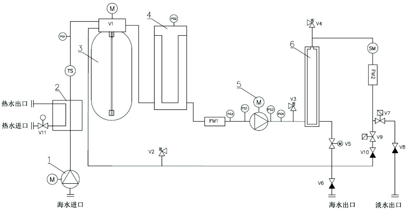 本实用新型涉及一种带换热装置的反渗透造水机,主要解决当海水温度较低时产水量下降的技术问题。本实用新型包括增压泵,换热器,砂滤器,保安过滤器,高压泵,膜组,电动多路阀,压力开关,压力表,盐度计,电磁流量计,安全阀,电磁阀;所述砂滤器装有电动多路阀,所述增压泵,砂滤器,保安过滤器,依次串接布置在高压泵进口;换热器布置在增压泵和砂滤器之间,在热水进口安装有温控阀;在高压泵进口管路依次串接安装有电磁流量计,压力表,压力开关;在高压泵出口管路依次串接安装有压力开关,压力表,安全阀和膜组;在造水机的淡水出口依次串接安装有安全阀,盐度计,电磁流量计,电磁阀;在膜组的海水出口安装有电动调压阀。