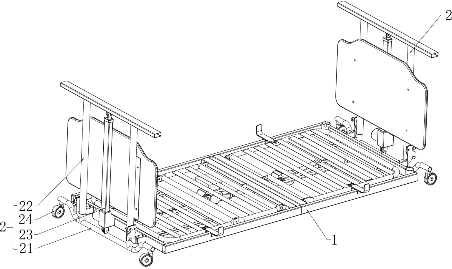 本实用新型公开了一种挂装式超低升降病床病床,包括床架以及分别设在床架前后端的两组支撑架,每组所述支撑架均包括固定支架和竖向滑动连接于固定支架上的升降支架,所述升降支架与床架的端部之间通过至少两组连接件相配合连接,其中,每组所述连接件均包括挂装部和一体连接于挂装部的侧面底部位置的插接部,所述挂装部开设有至少两个与升降支架上预设有的固定卡柱相挂装配合的卡槽,所述插接部呈水平插接至床架端部预设有的插口内,并且所述插接部与插口之间通过插销相固定连接。