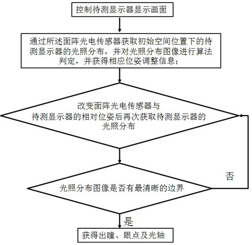 本发明提供了一种近眼显示器的测量方法及装置,使用不设置成像镜头的面阵光电传感器和传动装置获得待测近眼显示器的出瞳参数,有效解决了现有的近眼显示器眼点及光轴测量技术误差较大、设备复杂昂贵、操作复杂且效率低下的问题。