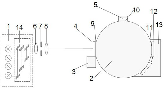 本实用新型公开一种透射测量装置,包括白光光源、积分球、光谱测量装置和载样移动平台,所述积分球球壁上设有入射口和探测口,所述光谱测量装置与探测口光学耦合,载样移动平台设于白光光源和积分球的入射口之间;白光光源发出的光束透过安装在载样移动平台上的样品、经积分球的入射口进入积分球,在积分球内充分混光后,从积分球的探测口出射,被光谱测量装置接收。所述积分球球壁具有均匀漫反射涂层。所述的载样移动平台可调节样品的位置,使白光光源入射样品的不同区域,实现其透射分布以及区域平均透射比测量。本实用新型结构简单,使用方便,可适用于光伏压花玻璃、装饰用压花玻璃、温室用压花玻璃等具有压花风格的材料透射特性测量。