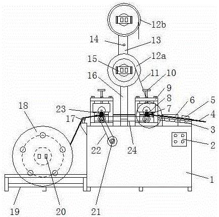 本实用新型的防火胶带和双面胶快速合成防火条装置涉及到生产防火条的专用设备。该合成防火条装置,其特征在于,在机架的工作台面上设有两对轧辊,每对轧辊由上轧辊和下轧辊组成,每对轧辊的两端设有轧辊座,在立柱的顶端与呈杠杆形的双面胶托盘座的中部用铰链连接,双面胶托盘座的两端设有转轴,在进料架的进料端设有防火胶带磁铁压板,在进料架的出料端设有双面胶磁铁压板,在机架还设有控制器、轧辊驱动电机,在机架旁设有力矩电机支架,在力矩电机支架上安装有力矩电机,在力矩电机的轴上设有防火条卷盘。本实用新型的合成防火条装置,结构科学、合理,使用方便,生产效率高,实现了十分快速地更换防火胶带、双面胶、防火条。具有推广价值。