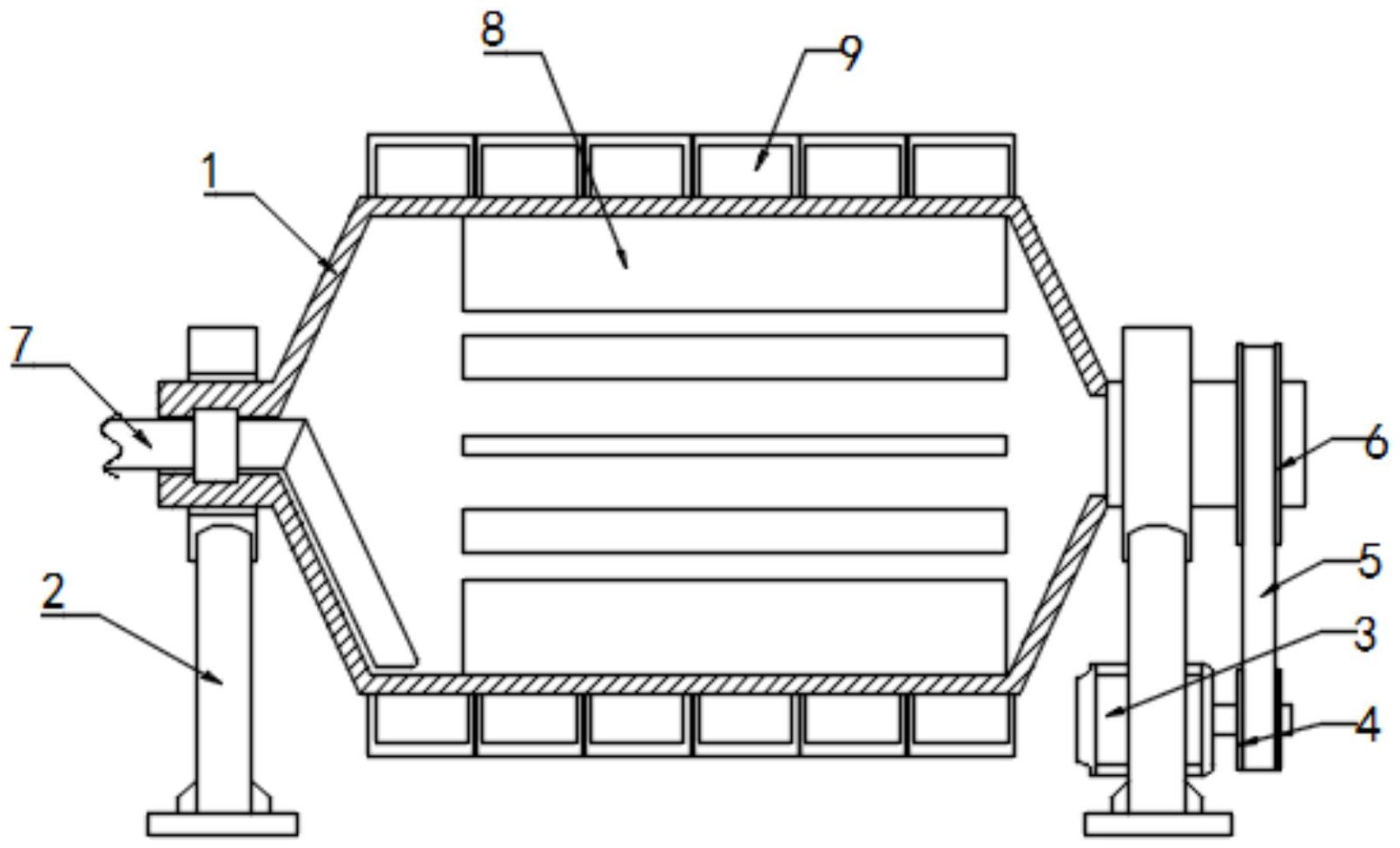 本实用新型公开了一种牛奶生产用巴氏杀菌机,包括灭菌罐,所述灭菌罐的外壁上环形阵列设置有多组水槽,且多组水槽中每组均设置有多个,并且水槽将灭菌罐的外壁完全包覆,所述水槽呈弧形结构,且水槽内部中空,并且水槽的两侧均通过连接管与外部输水机构连通,所述灭菌罐的内壁环形阵列有多个搅拌板。本实用新型中,通过外部加热机构将水流加热,并通过保温管道输送至水槽中,水槽中的热水对灭菌罐进行加热,由于水流持续流动,保证了热水良好的加热效果,通过多个水槽之间相互配合使用,使得灭菌罐外部各部分之间温差范围小,配合灭菌罐的往复转动,牛奶在其内部不断的流动,保证牛奶各部分受热均匀,提升灭菌效果。