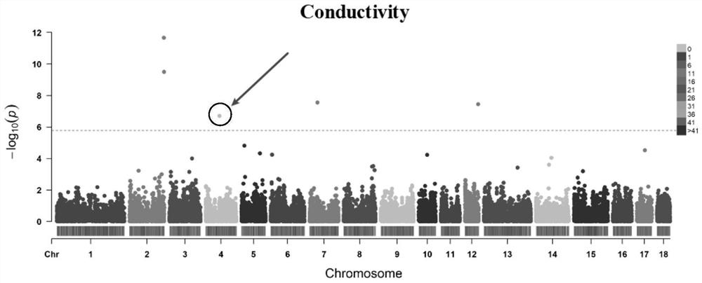 本发明涉及分子标记技术领域,特别涉及一种与猪肉质电导率性状相关的遗传分子标记利用该分子标记可对具有更高猪肉电导率的猪进行选育,选育方法为:采样,提取DNA并进行质量检测,进行基因分型得到SNP分型数据,获得一种与猪肉质电导率相关的分子标记,该SNP分子标记的核苷酸序列如SEQ ID NO:1所示,在序列的第51位碱基处存在一个A/C的等位基因突变,引起所示序列的核苷酸产生多态性,当该核苷酸序列上的第51位核苷酸为C时,猪肉具有更高的电导率,猪肉品质更好。