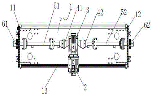 本实用新型公开了一种直角坐标机械手动力机构:包括主梁铝板、伺服电机、减速机、左联轴器、右联轴器、左传动轴、右传动轴、左传动齿轮和右传动齿轮。所述伺服电机固定于主梁铝板的上端面,所述伺服电机连接减速机、用于驱动减速机转动,所述左联轴器和右联轴器对称安装于减速机两侧的输出轴上;所述主梁铝板两端分别设有左挡板和右挡板,所述左传动轴一端与左联轴器连接,另一端固定于左挡板上且连接左传动齿轮;所述右传动轴一端与右联轴器连接,另一端固定于右挡板上且连接右传动齿轮。本实用新型利用对称的联轴器将伺服电机的扭力分解后传送到机械手升降部件上,通过增加受力点的方式提高了机械手的刚度。