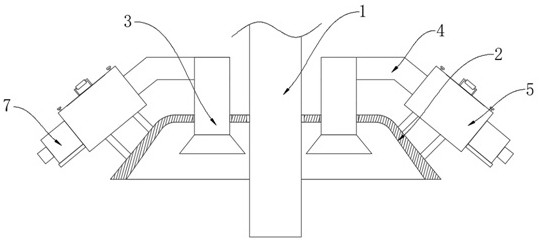 本实用新型公开了一种干粉生产线产品回收装置,包括出料管,所述出料管的外表面固定安装有聚集罩,所述聚集罩的上表面嵌设有回收管,所述回收管的数量为四个,每两个回收管为一组,每组所述回收管的相对面均设置有T型管道,所述回收管的底端延伸至聚集罩的内部并固定安装有回收罩,所述聚集罩的倾斜表面通过四个安装杆固定安装有回收箱,所述回收箱的内部设置有安装网管。该干粉生产线产品回收装置,通过设置聚集罩、回收管、T型管道、回收箱、安装网管、回收风机和粉尘过滤袋,并将回收管的数量设置为四个,使该回收装置能够对干粉装袋时产生的粉尘进行有效回收,提高了工作间的空气质量,同时降低了企业成本。