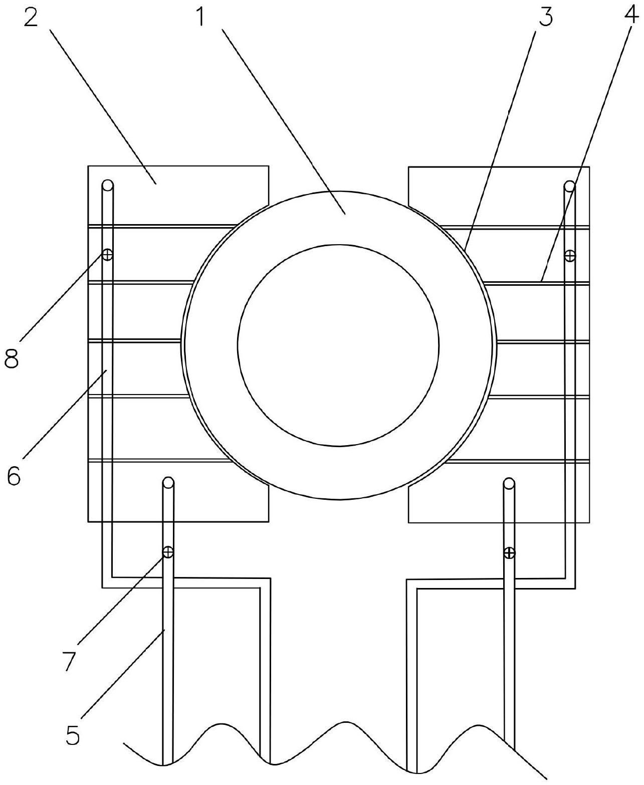 本实用新型公开了一种辊压机轴承座冷却装置。所述冷却装置包括:分别焊接在轴承座左右两侧的冷却水箱,所述冷却水箱与所述轴承座接触的一面设置为弧形凹槽结构,与所述轴承座外表面的形状相匹配;所述冷却水箱内部水平方向上间隔距离焊接有多个支撑板;所述冷却水箱正面靠下部连接有进水管,正面靠上部连接有出水管,所述进水管上设置有进水阀门,所述出水管上设置有出水阀门。所述冷却装置具有和轴承座接触面积较大的所述冷却水箱,冷却效果好。