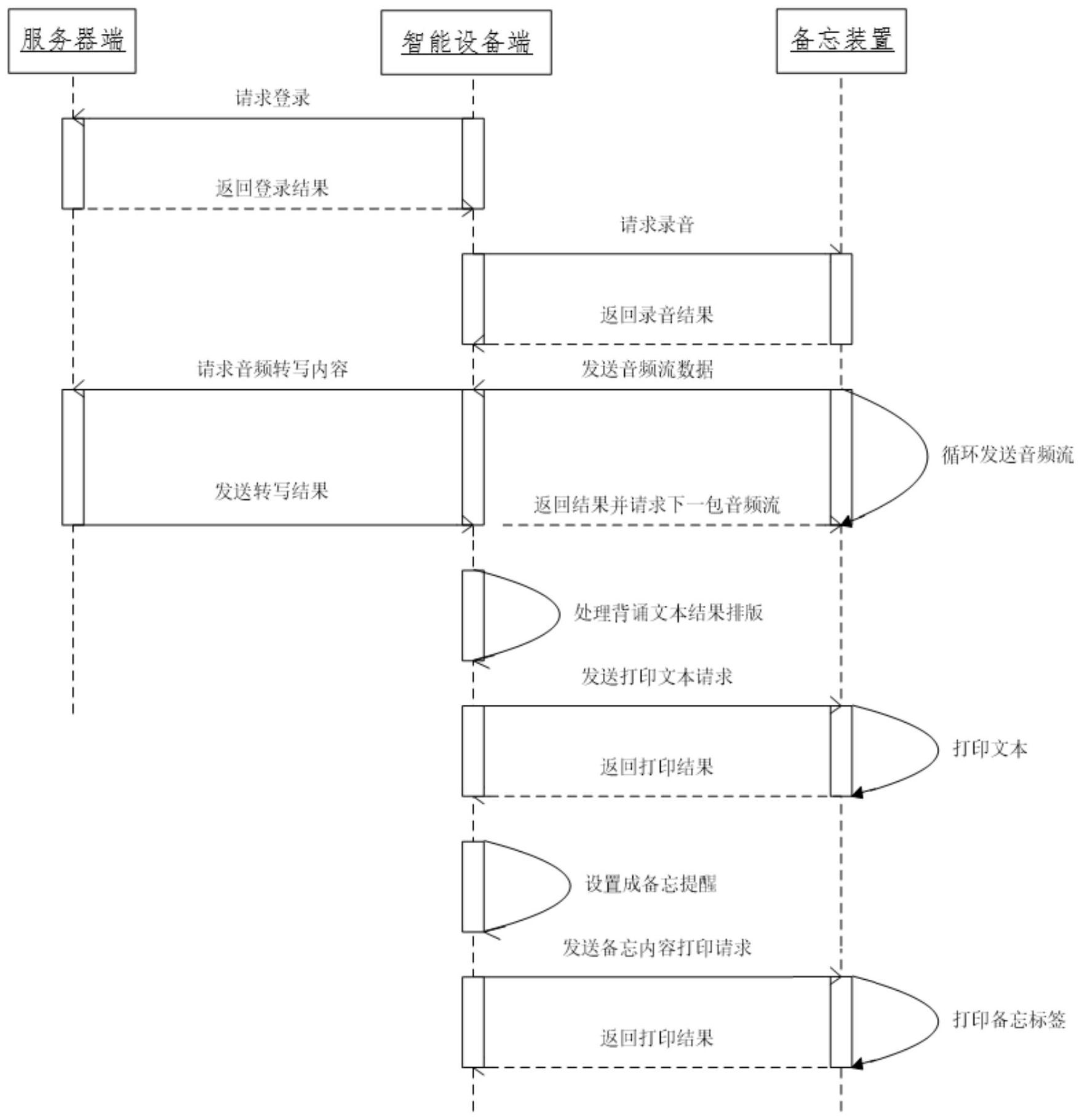 本发明公开了一种备忘装置及方法,该装置包括:语音输入模块,用于收集语音数据;转写模块,用于将语音数据转写为文本数据;打印模块,用于打印文本数据;通信模块,用于与智能设备端通信连接。本发明可以提高用户的记忆效率。