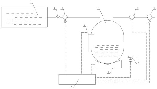 本实用新型涉及一种硫酸稀释调配系统。本实用新型包括硫酸储存箱和调配容器、称重传感器、水泵、电磁开关阀、控制系统,硫酸储存箱出口管路连接硫酸泵,硫酸泵出口管路连接调配容器的顶部并接入调配容器的容腔内,水泵输入口连接自来水管路或水箱,水泵输出口从调配容器的上部接入调配容器的容腔内,调配容器的底部设置称重传感器,称重传感器可对调配容器整体进行测量称重,调配容器底部设置出口管路,出口管路连接电磁开关阀,电磁开关阀出口连接供给工厂加工设备,硫酸泵、称重传感器、水泵、电磁开关阀分别连接控制系统,调配容器设置有电子液位计,本实用新型实现了使用酸的工厂低成本高精度、高安全性的强酸+水配比稀释。