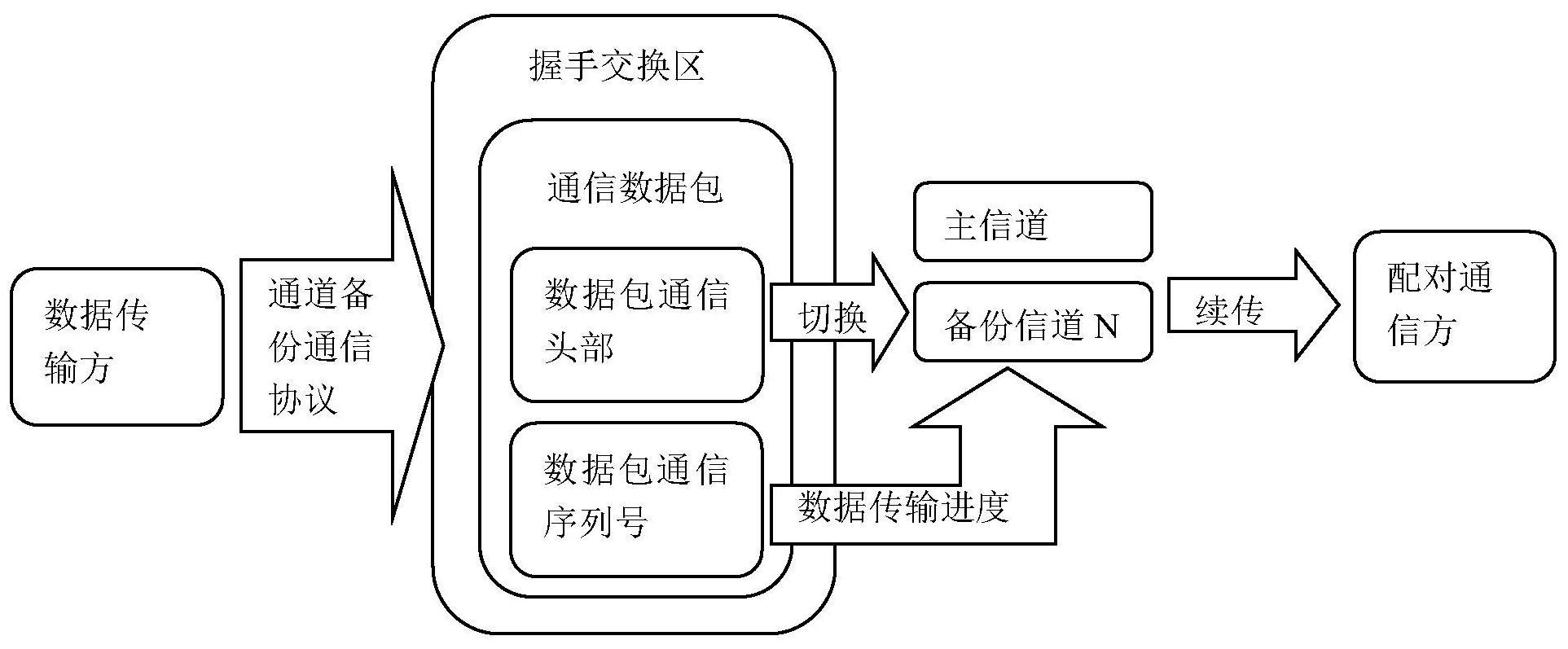 本发明提供了一种通道备份通信系统,其包括:在网络层加入通道备份通信协议,以定义通信数据包的通信头部及通信序列号;基于通信异常的判断及系统触发执行动作,依据该通信数据包的通信头部,切换对应备用通道;并依据该通信序列号完成该通信数据包的续传,从而解决了网络数据传输过程中通道不通畅,导致通信丢包或中断的相关技术问题,实现了网络传输通道的优选切换及数据续传功能,从而有效保障了网络数据传输的可靠性及数据传输效率。