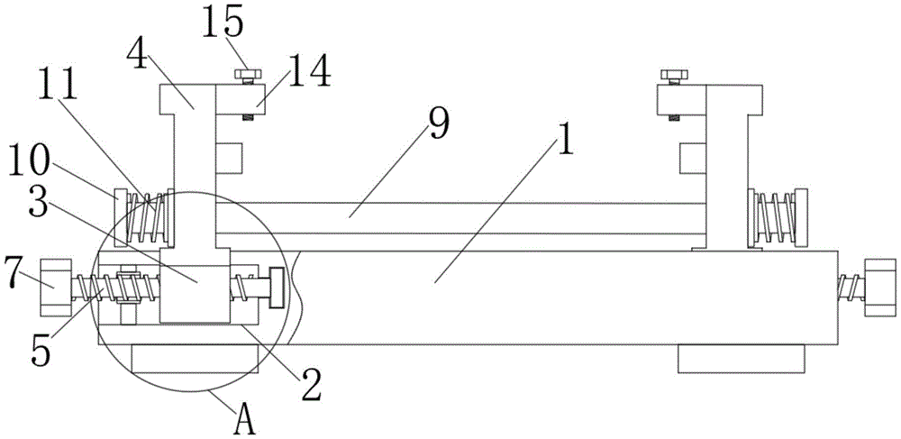 本实用新型属于固定技术领域,尤其为一种电梯无对重主机底座固定装置。本实用新型通过将电梯主机放置在固定座顶端,然后利用设备转动转动头,转动头带动螺杆进行转动,然后螺杆带动滑动块进行移动,然后利用滑动块的移动带动支撑架进行移动,从而将电梯主机进行夹持固定,利用第一固定螺钉将支撑架牢固的固定在固定座上,然后利用第二固定螺钉对电梯主机进一步固定,保证对电梯固定的强度,同时利用弹簧在滑动杆侧壁对支撑架进行支撑,提高了该固定装置的使用性能,避免因电梯主机的固定部件老化会产生松动的现象,使得固定底座固定的更加牢固,提高了电梯底座固定装置的使用寿命,保证电梯正常的使用,使得居民使得电梯的便利。