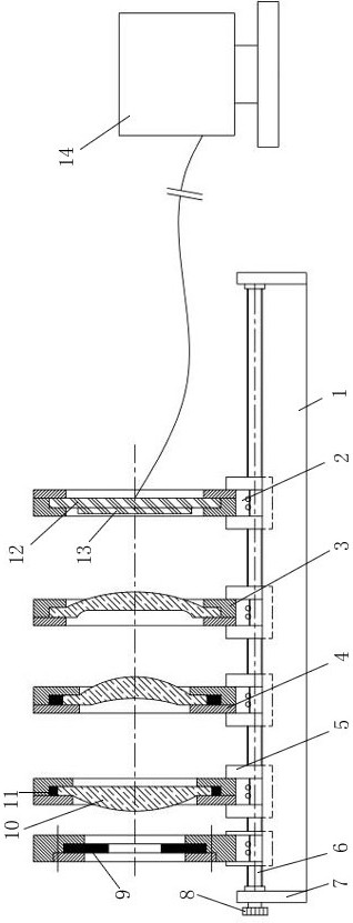 本实用新型涉及一种光学系统教学展台,包括支撑平台、各个透镜、光阑和带有成像传感器的线路板,线路板的信号输出端与计算机相连,其技术要点是:各个透镜、光阑和线路板的外周分别设有承载框和与承载框配合的侧盖,承载框下沿固定有丝套和左、右支撑轮组,所述丝套在水平方向上位于左、右支撑轮组之间,且各个承载框上的丝套在水平方向上交错布置,支撑平台由相互平行的左、右支撑轨、连接于左、右支撑轨前、后端的前、后支撑块组成,左、右支撑轨上表面设有与左、右支撑轮组对应的通长凹槽,前、后支撑块之间设有与各个丝套一一对应的丝杠,丝杠远离线路板的一端固定有旋钮。本实用新型解决了现有教学展示设备存在的操作复杂的问题,省时省力。