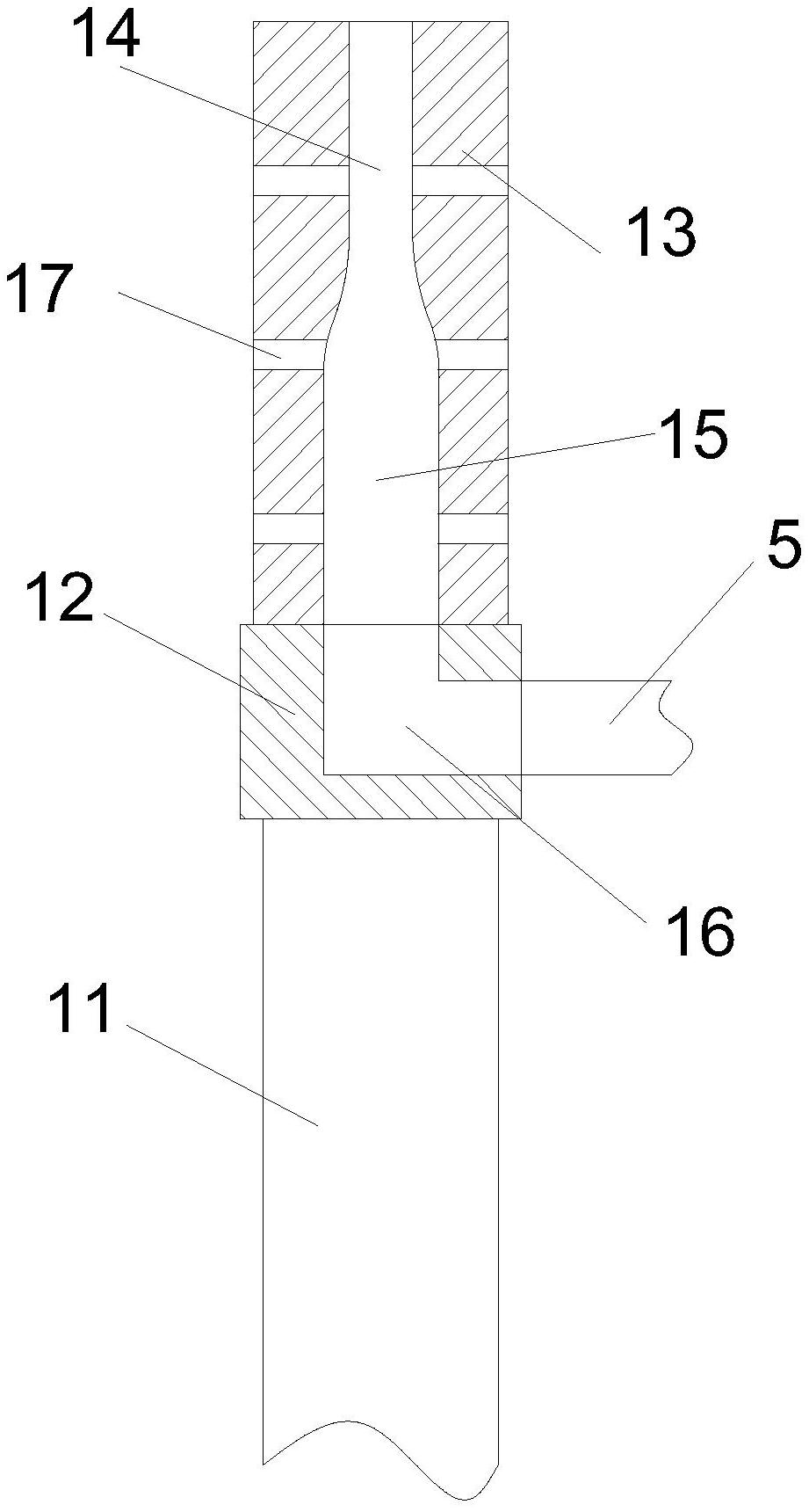 本实用新型公开了一种扁管托舌清渣装置,弯管机包括固定组件、弯管组件和支撑组件,所述扁管套装在所述支撑组件上,且所述扁管位于所述固定组件和所述弯管组件之间,所述支撑组件包括:扁管托舌、定位连接件、连接杆和清渣气泵组件,所述扁管套装在所述扁管托舌上,所述连接杆通过所述定位连接件与所述扁管托舌固定连接,所述扁管托舌内部设置有气孔组,所述清渣气泵组件的供气端与所述气孔组件连通。本实用新型通过在扁管托舌内部设置气孔组,并通过清渣气泵组件向气孔组内泵入高压气体,在高压气体的冲击下,将扁管弯折的过程中产生的金属废屑从弯管内部或弯管托舌外侧面清除。