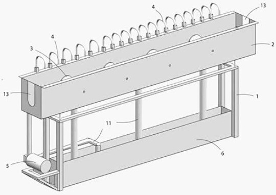 本实用新型公开了一种不锈钢管覆塑冷却装置,属于不锈钢管加工技术领域,该装置包括支架,所述支架上设有冷却槽箱,所述冷却槽箱的两端各开设有供不锈钢管穿过的开孔,所述冷却槽箱上沿两个所述开孔之间连线均匀设置有若干个用于传送不锈钢管的滚轮,相邻所述滚轮之间设置有至少一个用于冷却不锈钢管的喷淋机构。本实用新型提供的不锈钢管覆塑冷却装置能够对不可锈钢管覆塑过程起到冷却降温作用,简单实用。