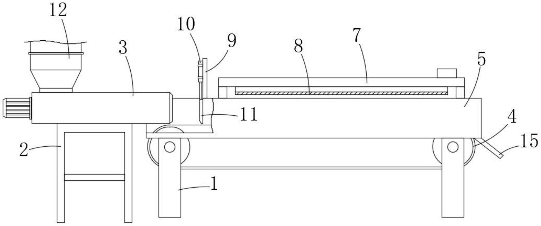 本实用新型公开了一种水泥粉磨用水泥原料干燥装置,包括螺旋输送器与带式输送机,所述带式输送机固定安装在第一机架的上部,所述螺旋输送器的出料口设置于带式输送机的一端上方,所述第一机架的上部固定连接有第一挡板与第二挡板,且第一挡板与第二挡板分别位于带式输送机的两侧侧部;通过带式输送机、刮板与加热板等结构的设计,通过螺旋输送器可将需要进行烘干的水泥物料输送至带式输送机的一端,并通过带式输送机对水泥进行输送和摊开,同时在带式输送机的一端设置可进行上下调节的刮板,通过上下的高度调节,可调节带式输送机传送带上水泥的厚度,进而调节加热板的烘干效果同时获得较为方便的水泥烘干干燥方式。