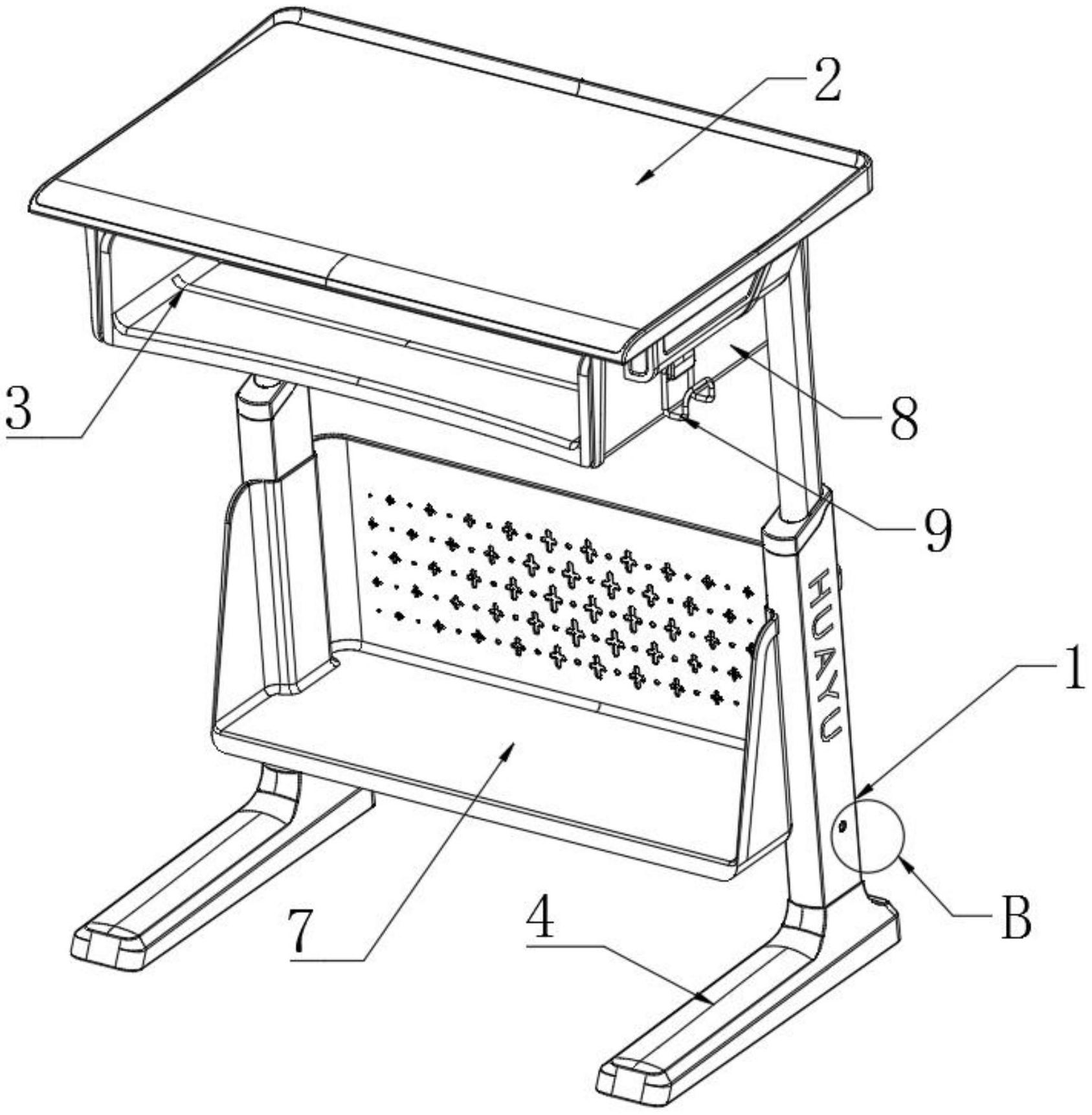 本实用新型公开了一种可升降的课桌,包括升降腿,升降腿设置有两个,两个升降腿的顶部安装有桌板,升降腿包括壳体、移动杆、升降组件和调节孔,壳体内安装有升降组件和移动杆,且升降组件位于壳体底部,升降组件上端连接移动杆,移动杆的顶部伸出壳体并与桌板固定连接,移动杆与壳体滑动连接,壳体外侧壁上开设有调节孔。本实用新型中通过通过升降组件、壳体、移动杆等结构的设置,其能实现对桌板高度的调节,从而使得课桌实现升降的功能,提高其适应性,能根据学生自身高度进行自主的调节,实用性强。