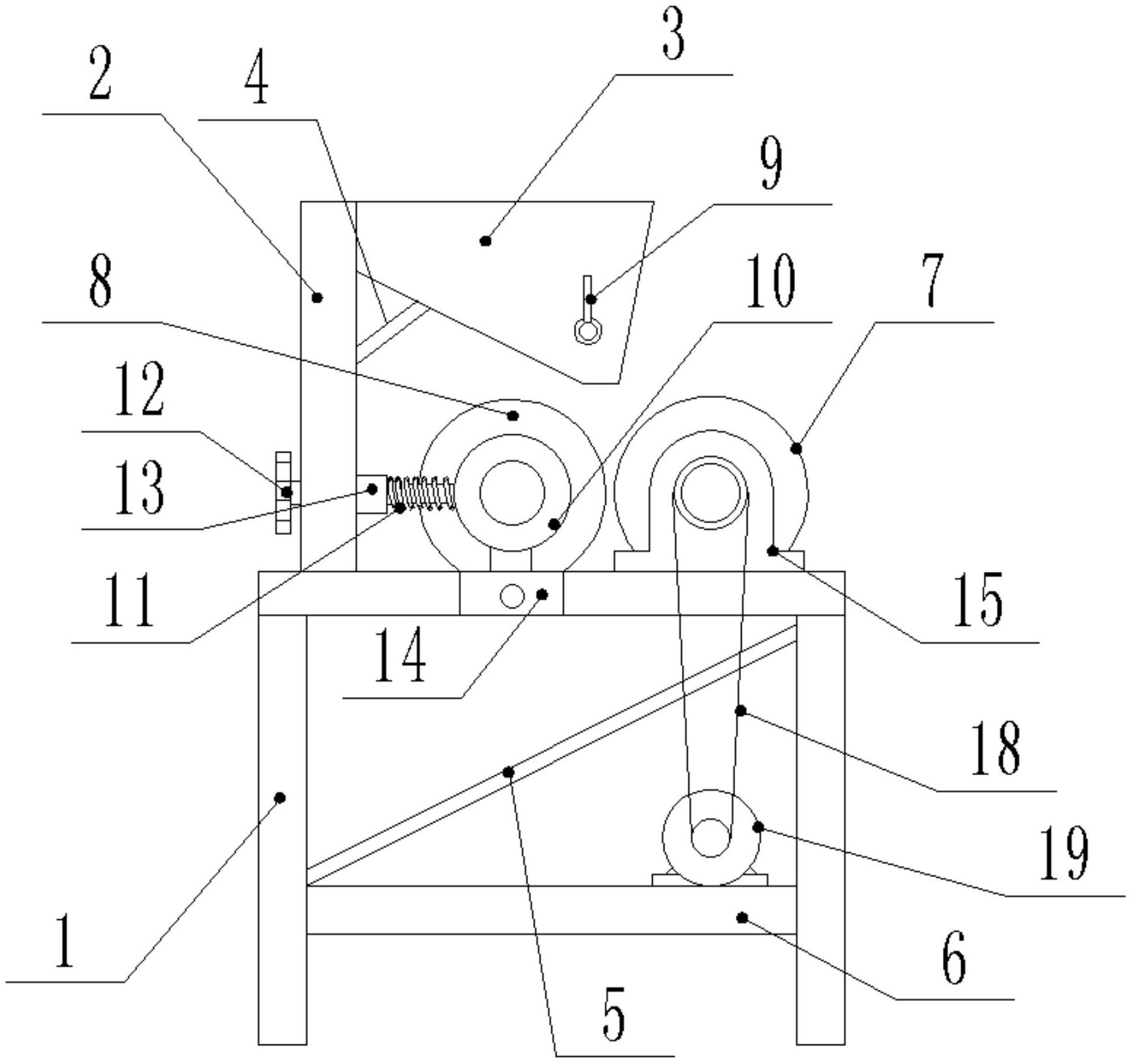 本实用新型公开了一种鲜花椒破壳装置,包括支撑架,所述支撑架固定有第一轴承座,在第一轴承座之间连接有第一挤压辊轮,在支撑架前后侧固定有安装框,在每一安装框中固定连接有转动销,所述转动销上转动连接有第二轴承座,在两第二轴承座之间转动连接有第二挤压辊轮,在第二轴承座的左侧还固定有连接杆,连接杆上固定有压缩弹簧,支撑架的左侧还固定有一立架,在立架上固定有一料斗,料斗的出料口处于第一挤压辊轮和第二挤压辊轮之间,所述第一挤压辊轮其中一侧的转动轴上还固定有皮带轮,所述支撑架上固定有驱动电机,驱动电机和第一挤压辊轮上的皮带轮通过皮带连接。该鲜花椒破壳装置结构简单,能够快速的对鲜花椒进行破壳,破壳效率高。