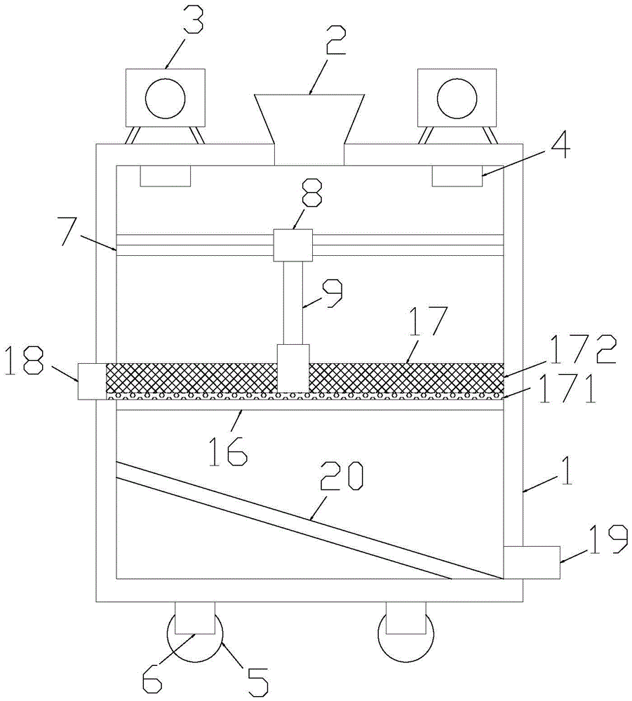 本实用新型公开了一种茶叶加工用烘干装置,包括烘干箱,烘干箱的顶部设有入料口,烘干箱的顶部于入料口的两侧均安装有热风机,热风机的底部连接有进风管,进风管远离热风机的一端插入烘干箱内;烘干箱内横向设有电动滑轨,电动滑轨上设有电动滑块,电动滑块的底部固接有连接杆,连接杆远离电动滑块的一端固接有安装板,安装板的两侧分别固接有第一竖杆和第二竖杆,安装板的底部滑动连接有多个划杆;第一竖杆远离第二竖杆的一侧安装有驱动电机,驱动电机的输出端穿过第一竖杆后固接有丝杆,丝杆远离驱动电机的一端穿过多个划杆后与第二竖杆连接;烘干箱内于电动滑轨的下方设有支撑格板,支撑格板上设有容纳腔;本实用新型使茶叶烘干的效果好。