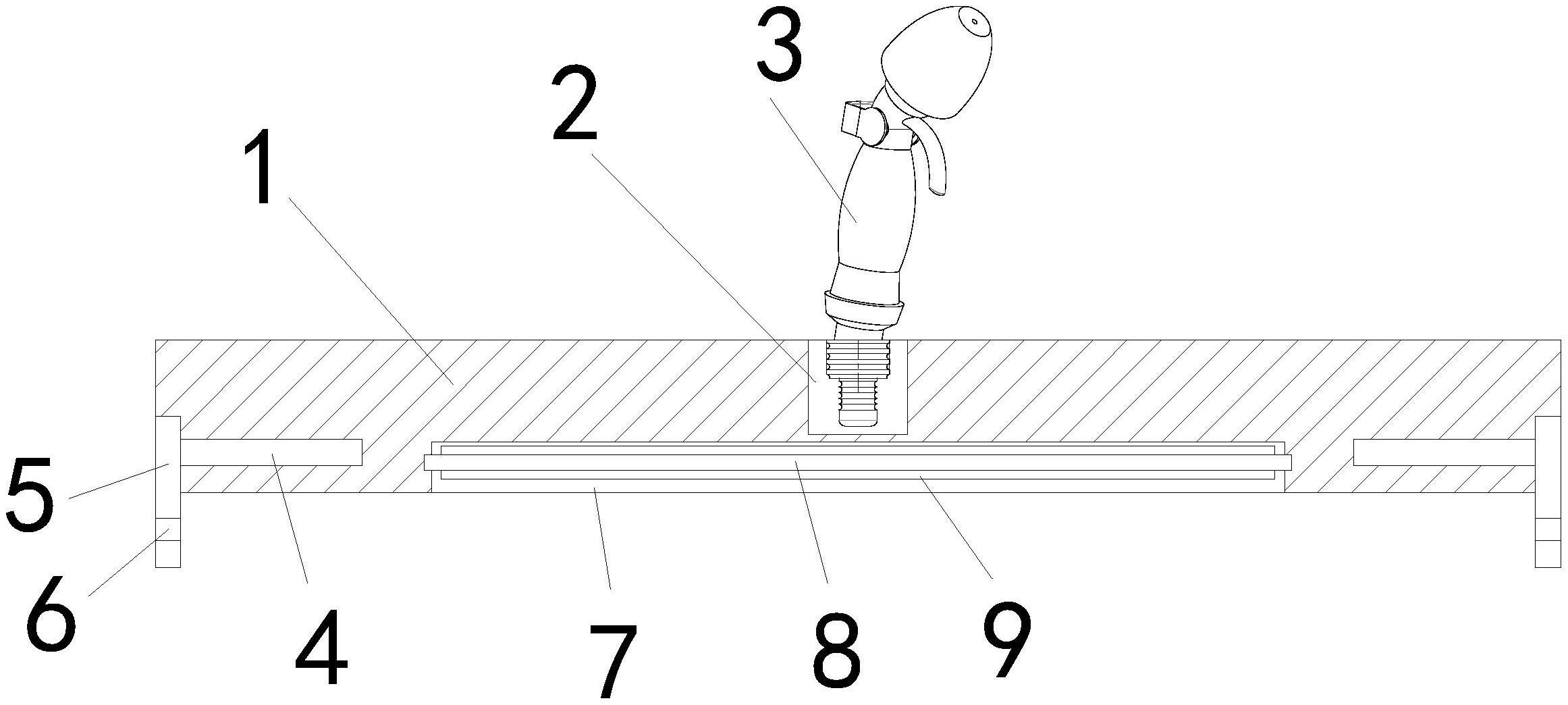 一种具有回收处理功能的茶叶精制加工降尘装置,其结构包括固定横梁,固定横梁顶面中部设有一装配槽,装配槽上旋有雾化喷头,固定横梁两端均活动嵌有一定位杆,定位杆远离固定横梁的一端设有装配板,装配板上设有螺栓孔,固定横梁中部内设有一收卷槽,将固定横梁安装于萎凋槽顶部边缘,在装配板上旋上螺栓与萎凋槽进行固定连接,之后拉动拉板,拉板带动覆盖集尘布伸出固定横梁,覆盖集尘布将萎凋槽的槽口进行覆盖遮蔽,最后开启雾化喷头,雾化喷头喷出的水雾与空气中的粉尘混合下落,落在覆盖集尘布上进行回收,在降尘结束,直接对覆盖集尘布进行清理,提高了降尘工作的便利性。