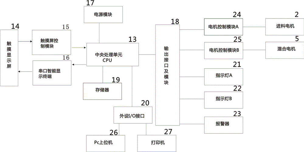 本实用新型公开了一种饲料生产中混料设备控制系统;其特征在于:所述控制系统具有中央处理单元、触摸显示屏、触摸屏控制模块、智能显示终端、电源模块、输出接口及模块、存储器、外设I/O接口、指示灯A、指示灯B、报警器、电机控制模块A、电机控制模块B;本实用新型所述控制系统电路结构简单,投资少,控制系统不仅自动化程度高,运行灵活,适用于饲料加工中物料混合装置的控制。
