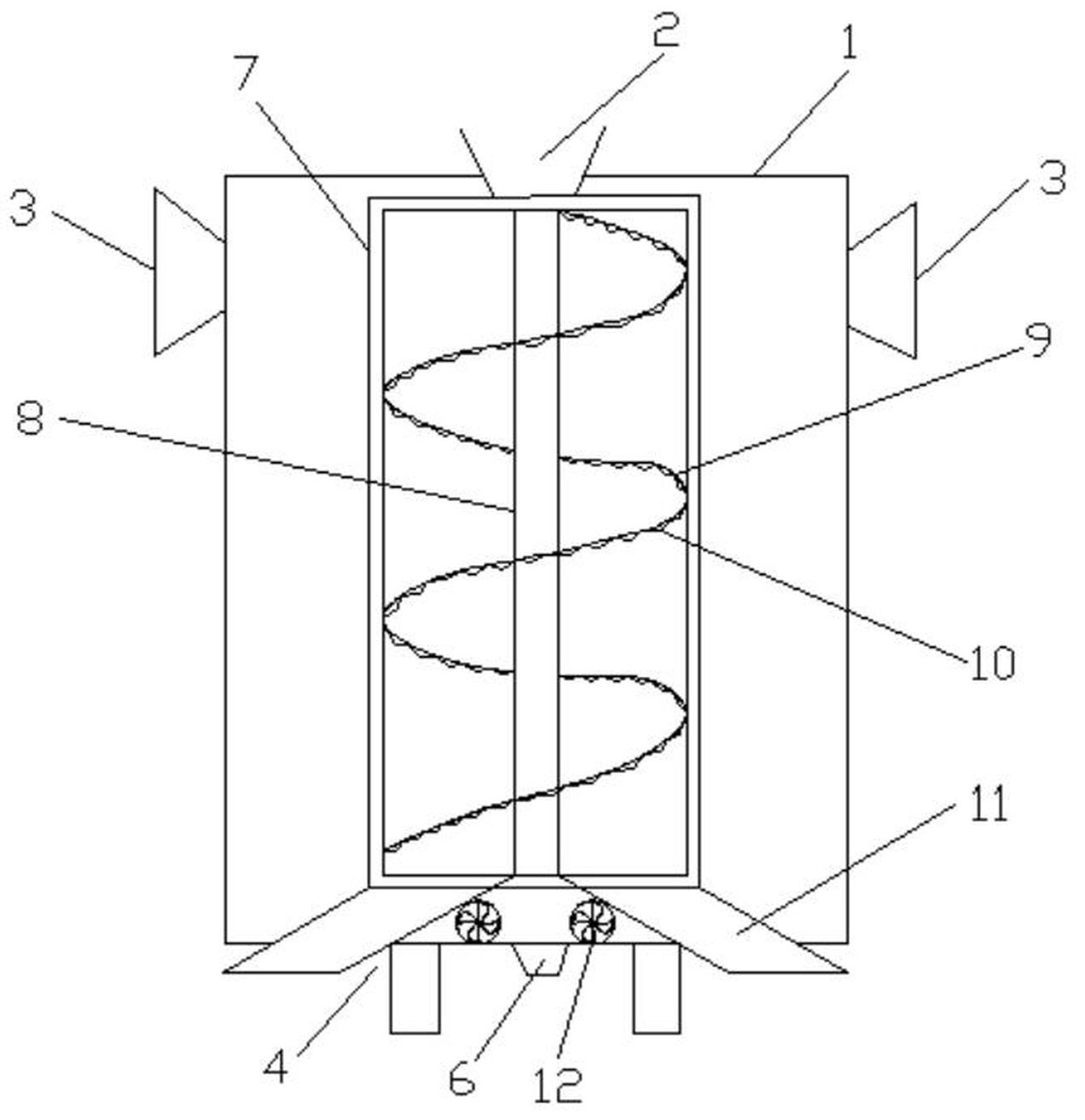本实用新型涉及一种用于复合肥料的滚筒干燥机,包括机体,所述机体顶部设置有进料口,中部设置有出气口,底部设置有出料口和进气口;所述进料斗的出口位于干燥筒的上方,所述干燥筒设置在机体内,所述干燥筒内设置有中心柱,所述中心柱上设置有旋转梯,所述螺旋梯上设置有加热丝,所述加热丝外接电源;所述干燥筒的出口连接有散热板,所述散热板倾斜设置在机体内,所述散热板的高端与干燥筒的出料端连接,所述散热板的低端与出料口连接,所述机体内设置有与散热板配合散热的风扇,且所述风扇位于散热板下方,所述风扇的出风口正对散热板。本实用新型能够将复合肥料进行有效的干燥,并能及时降温,避免复合肥料粘结。