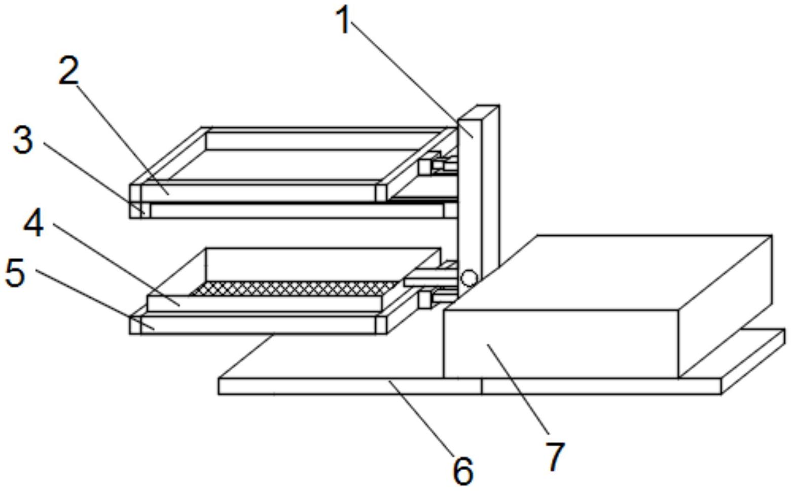 本实用新型公开了一种具有除尘功能的普洱茶加工筛分设备,包括支柱,所述支柱的一侧从上至下依次安装有筛选屉与承接屉和滤网屉、水洗屉,且筛选屉安装在承接屉的顶端,滤网屉安装在水洗屉的顶端,所述支柱的另一侧安装有烘干箱,所述支柱的底端安装有支撑底座,所述筛选屉的一端安装有伸缩杆,所述伸缩杆的远筛选屉的一端安装有液压缸,且液压缸安装在支柱的内部靠顶端,所述承接屉的前端安装有拉板,所述滤网屉的一端安装有固定板与连接杆,且固定板位于连接杆的顶端,且连接杆的一端贯穿支柱的一侧,所述连接杆的前端安装有旋转扣扭;本实用新型具能够提高筛分的效率,增加除尘的功能,使其能快速进入下一道工序,提高生产效率。