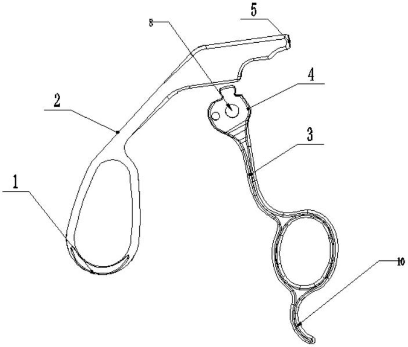 本实用新型公开的属于医疗器械技术领域,具体为一种医疗器械手柄,包括前手柄与后手柄,所述后手柄内部下方设有后手圈,所述后手圈上下两端均设有半圆弧内壁,上侧的所述半圆弧内壁小于下侧的半圆弧内壁,所述前手柄内部下方设有前手圈,所述前手圈下壁外表面固定连接有钩头,所述前手柄与后手柄之间均设有连接端,所述前手柄上的连接端内部开设有第一连接孔,所述后手柄上的连接端内部开设有第二连接孔,所述第一连接孔与第二连接孔之间设有轴销,所述第一连接孔与第二连接孔之间通过轴销转动连接,后手柄指圈内部上下侧所开设的半圆弧内壁,更加符合人体力学构造,不会出现卡手的情况。