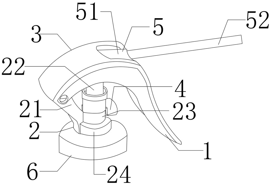 本实用新型涉及一种带开关扣合的水状喷头,包括把手触动器、连接座、主体、开关、喷头和瓶盖;所述把手触动器固定设置于主体一侧,与主体整体连接处存在有U型开口;所述连接座包括连接臂、连杆、上连接盖和下连接盖;所述主体设置有咬合口,所述主体与把手触动器连接处存在有U型开口;所述开关包括卡扣和拨片,所述卡扣插入上连接盖螺口内;所述喷头包括有喷头帽和吸管,所述喷头帽与连杆上端固定连接置于主体内侧;所述瓶盖包括防滑条和插入口。本实用新型开关的设置避免了因儿童的误碰而产生的意外,同时防滑条的设置可以更加有效固定铝杯边缘和喷头,降低意外掉落喷头的可能性,使用安全方便,不费力,设计新颖、结构简单合理。