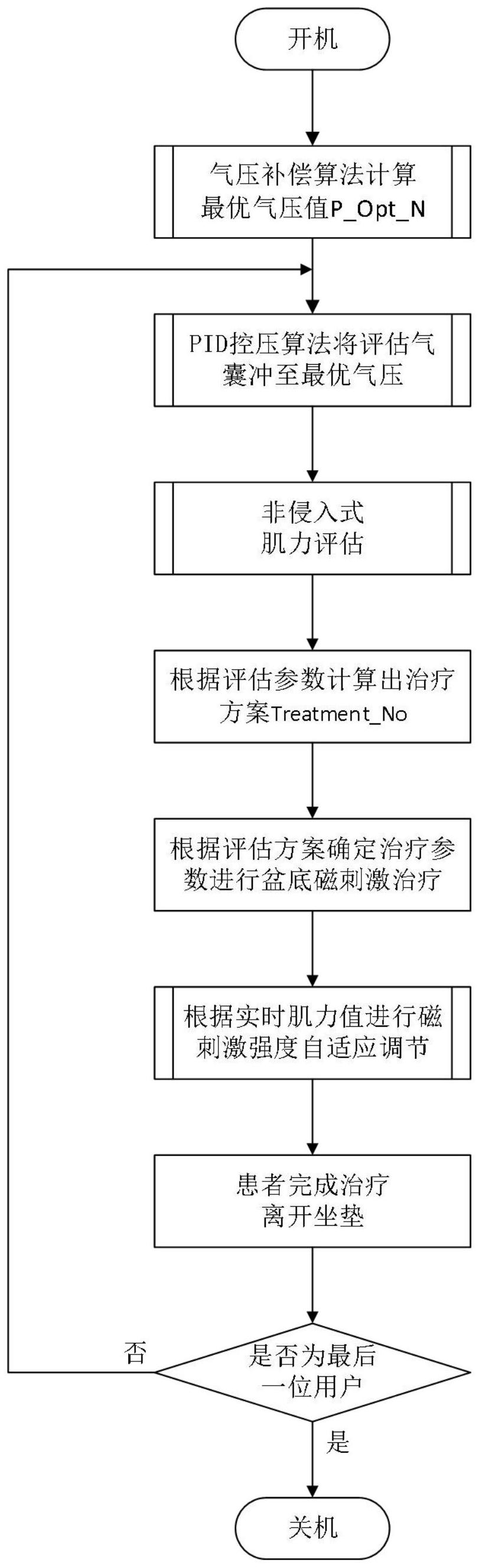 本发明涉及一种用于盆底磁刺激的非侵入式肌力检测系统,评估模式下,基于肌力检测气囊采集盆底肌肌力收缩高度及平均收缩上升及下降时间,以及盆底肌持续收缩下肌力最大收缩高度;根据上述肌力评估数值和盆底肌映射函数,计算肌力评估方案;实时采集磁刺激治疗时目标肌群的肌力值,与治疗过程中肌力收缩阈值作判定,根据判定结果调整下一时刻的刺激强度。本发明基于肌力检测气囊,采用非侵入式方式实时采集用户盆底肌力值,帮助用户完成治疗前的盆底肌力评估,并选择适合当前肌力情况的治疗方案,同时在治疗过程中实时检测并分析磁刺激时的肌力状态,进而优化方案参数,提高治疗效果。