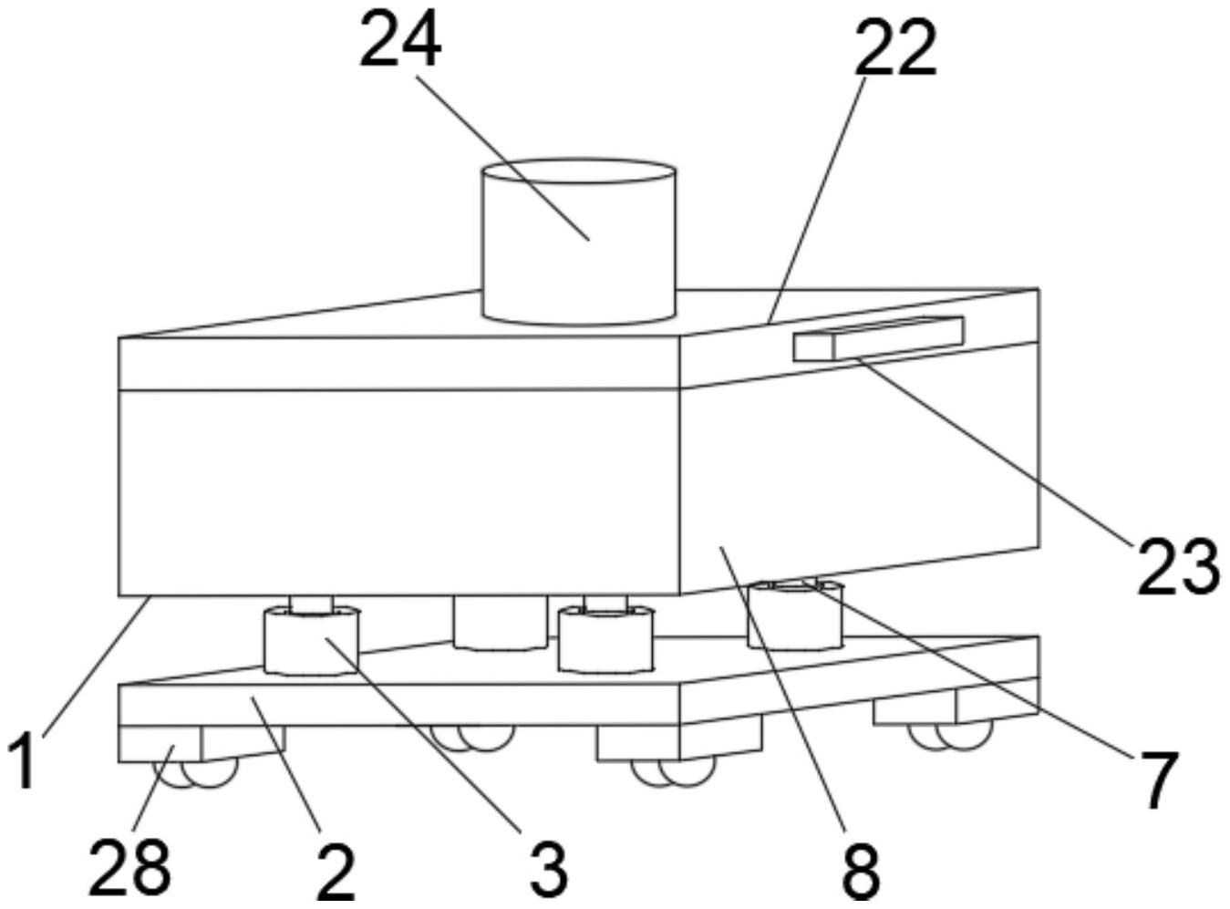 本实用新型涉及茶叶发酵技术领域,且公开了一种茶叶发酵设备,包括装置本体,所述装置本体包括座板,所述座板的顶部连接有四个等距离排列的端块,所述座板的上侧设置有发酵箱体,所述发酵箱体的底部连接有四个等距离排列的支撑脚,四个所述端块上均开设有开口,四个所述端块的内部均设置有固定板,所述固定板和端块之间设置有多个等距离排列的阻尼弹簧。该茶叶发酵设备,通过在座板上设置的端块,端块上开设的开口,端块内部设置的固定板和阻尼弹簧,发酵箱体底部固定的支撑脚,达到了减震降噪的效果,通过在茶叶放置箱的内部设置的过滤网和碎屑放置斗,可以对搅拌的茶叶造成的碎屑进行过滤收集。