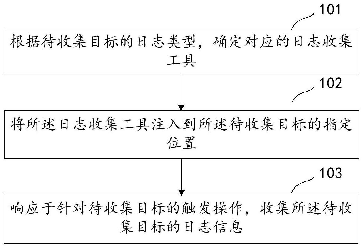 本发明实施例提供一种日志收集方法、装置,该方法包括:根据待收集目标的日志类型,确定对应的日志收集工具;将所述日志收集工具注入到所述待收集目标的指定位置;响应于针对待收集目标的触发操作,收集所述待收集目标的日志信息。通过上述技术方案,在无需进行大量埋点的情况下,能够实现针对待收集目标中各类型日志信息的全面收集,在满足日志收集需求的同时不会增加工作量,而且不会影响待收集目标的扩展和维护工作。
