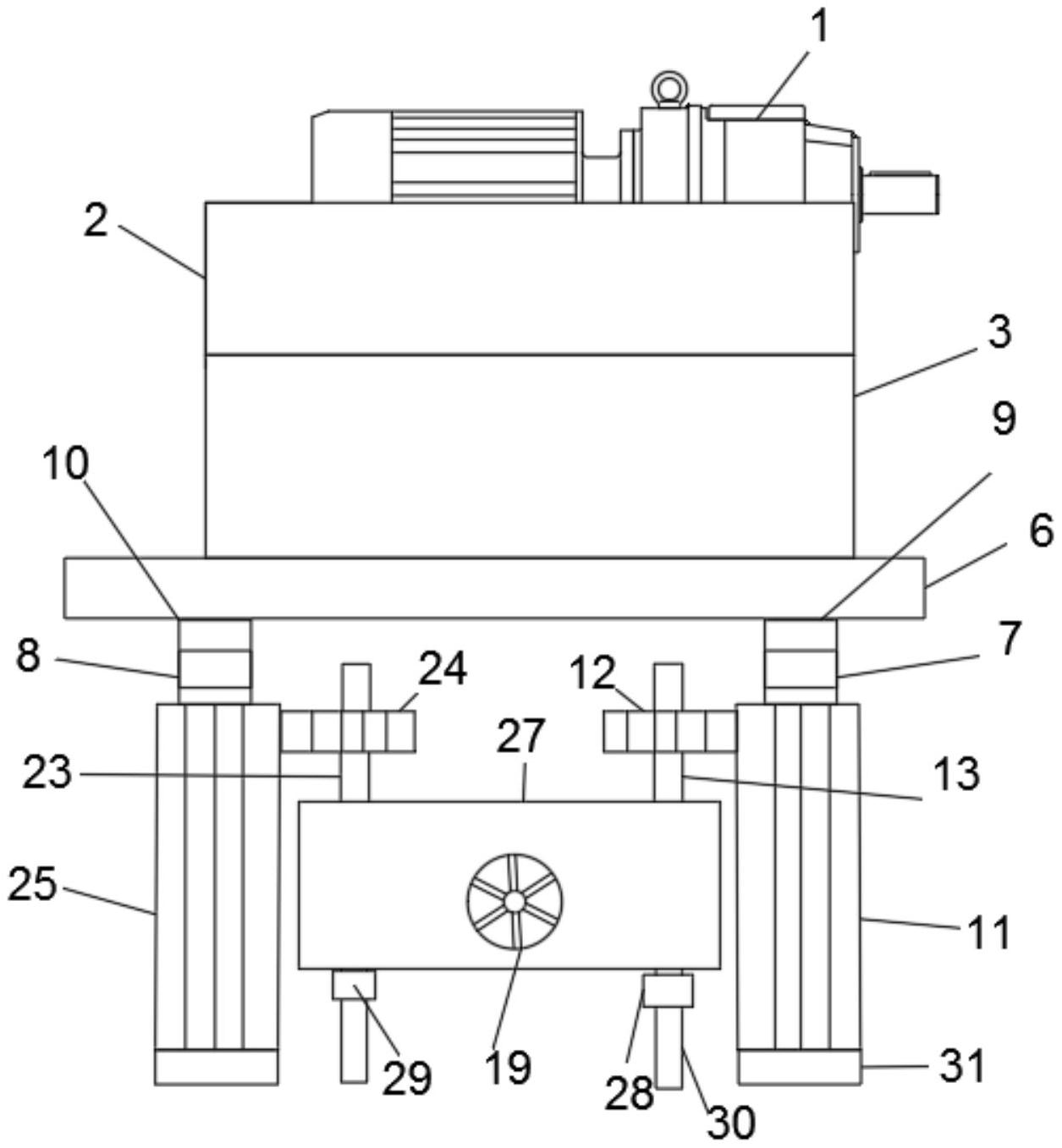 本实用新型公开了一种便于检修的摆线针轮减速机机架,包括摆线针轮减速机,摆线针轮减速机下端固定连接固定壳,固定壳下端固定连接减震箱,减震箱下端固定连接支撑座,支撑座下端一侧固定连接第一支撑柱,第一支撑柱下端固定连接第一轴承,第一轴承下端固定连接第一螺纹杆,第一螺纹杆螺纹连接第一齿轮管,本实用新型所达到的有益效果是:通过设置的减震箱使摆线针轮减速机在机械运作时能减少震动对减速机的影响,若干齿轮与锥齿轮的组合及转把的转动,将摆线针轮减速机能够进行上下移动,使的检修更便于进行。