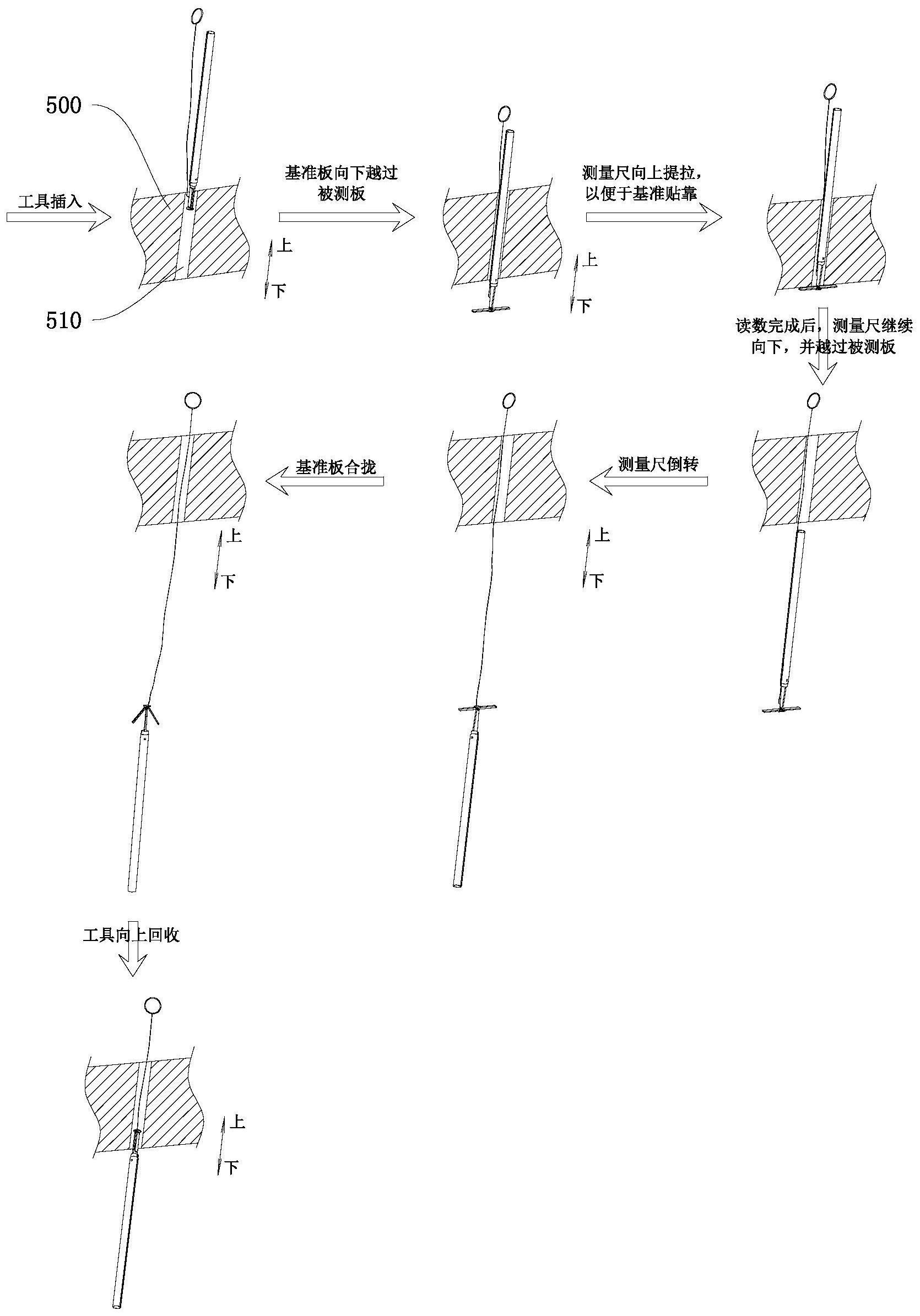 本发明公开了一种板厚测量工具及方法,测量尺的一端设置有挡部,销轴连接测量尺的一端,基准板包括板本体和拐臂,拐臂的一端连接板本体,另一端偏离板本体所在的平面,且拐臂的另一端可转动连接销轴,基准板抵接挡部时基准板的面向测量尺的侧面相对测量尺垂直,牵引绳测量尺的一端或者销轴连接牵引绳的一端。一个人在被测板上方进行操作,在被测板上方将工具往测量孔插入,基准板向下越过被测板之后就会在自身重力下作用下偏摆打开,测出板厚之后,让测量尺也向下越过被测板,测量尺在牵引绳的吊坠下发生偏转,基准板合拢。所以,实现单人简易测量,解放人力,减少测量配置人员。