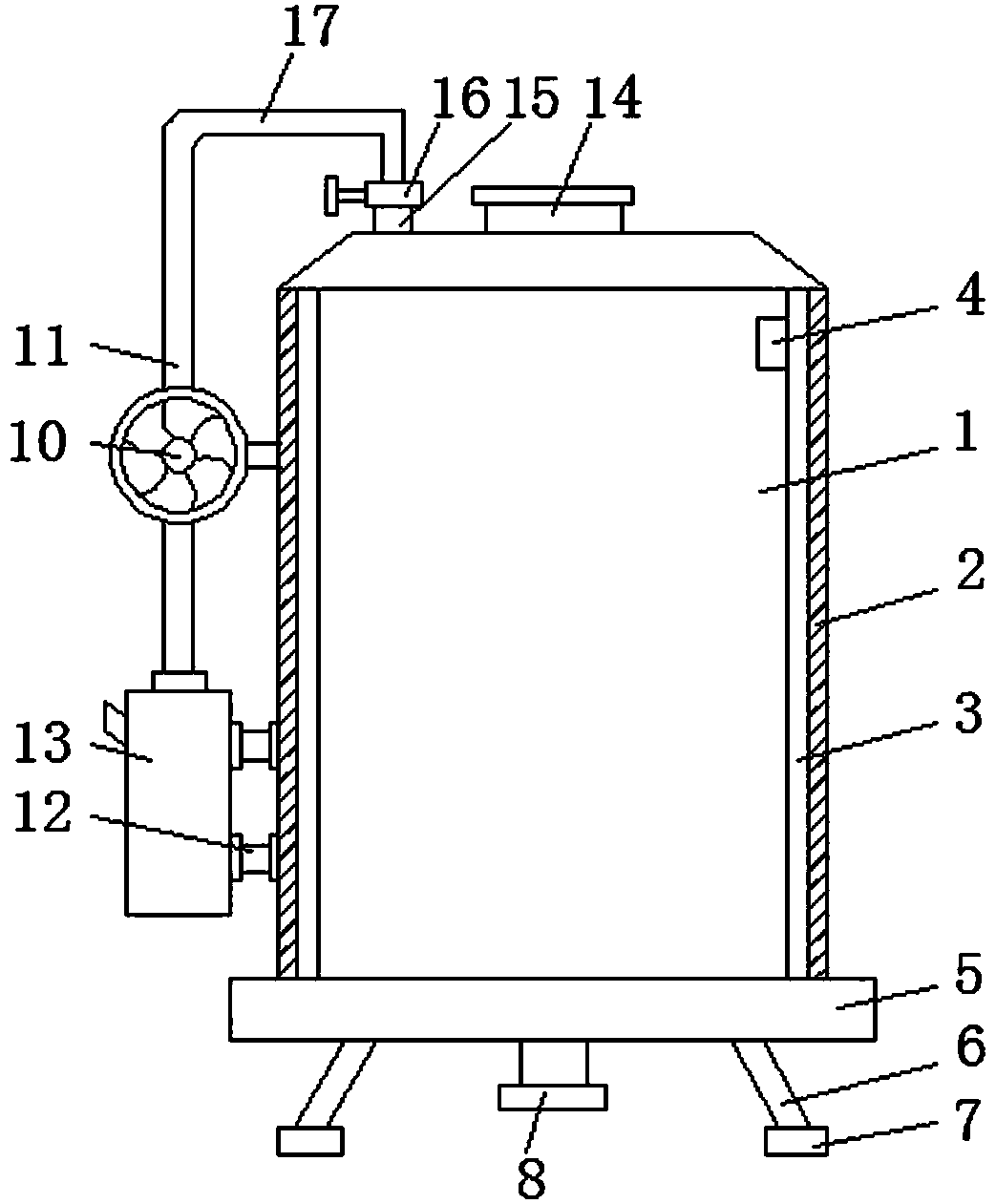 本实用新型公开了一种粒状热熔胶生产装置,包括支撑底板和T型螺栓,所述支撑底板的顶端安装有反应釜外壳,所述反应釜外壳的内壁安装有不锈钢耐腐蚀层,所述不锈钢耐腐蚀层上安装有温度传感器,所述反应釜外壳的底端中心处连接有出料管,所述排气口上螺纹连接有排气阀,所述排气阀上螺纹连接有输气管,所述输气管的一端螺纹连接有抽风机,所述净化罐体的顶端安装有橡胶密封接口,所述净化罐体侧面设置有出气口。本实用新型,抽风机将溶胶生产时产生的二氧化硫有毒气体输送到净化罐体内,与水形成亚硫酸根、硫酸根的形式,既能消除有毒气体,同时也可对形成的亚硫酸根、硫酸根再次利用,十分的实用。
