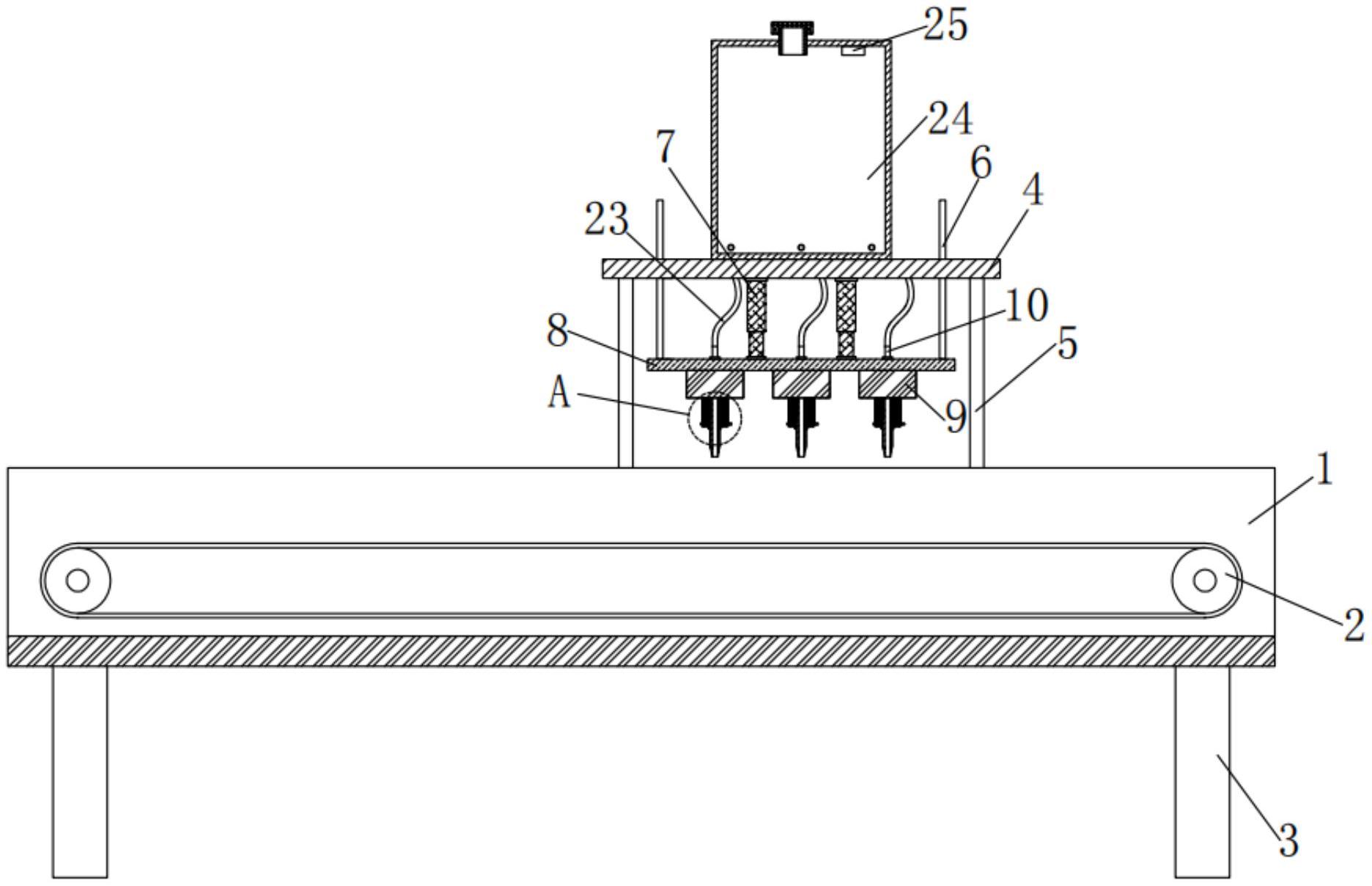 本实用新型涉及胶黏剂生产技术领域,具体涉及一种快干型水性滤清器胶黏剂灌装设备,包括输送座,所述输送座的顶部固定安装有输送机,所述输送座的底部四角均固定连接有支撑立柱,所述输送座的上方设有顶板。本实用新型克服了现有技术的不足,通过通过设置气缸、橡胶密封圈和弹簧的设置,使得气缸启动工作时带动安装板和灌装管向下运动,从而使灌装管贯穿灌装瓶瓶口插入灌装瓶内部,待橡胶密封圈运动至与灌装瓶瓶口接触后,气缸带动灌装管和固定环继续向下运动,使得弹簧被压缩,从而使橡胶密封圈在弹簧的弹性作用下将灌装瓶的瓶口密封,防止灌装瓶在灌装过程中瓶口敞开,使得胶黏剂容易被风干失效。