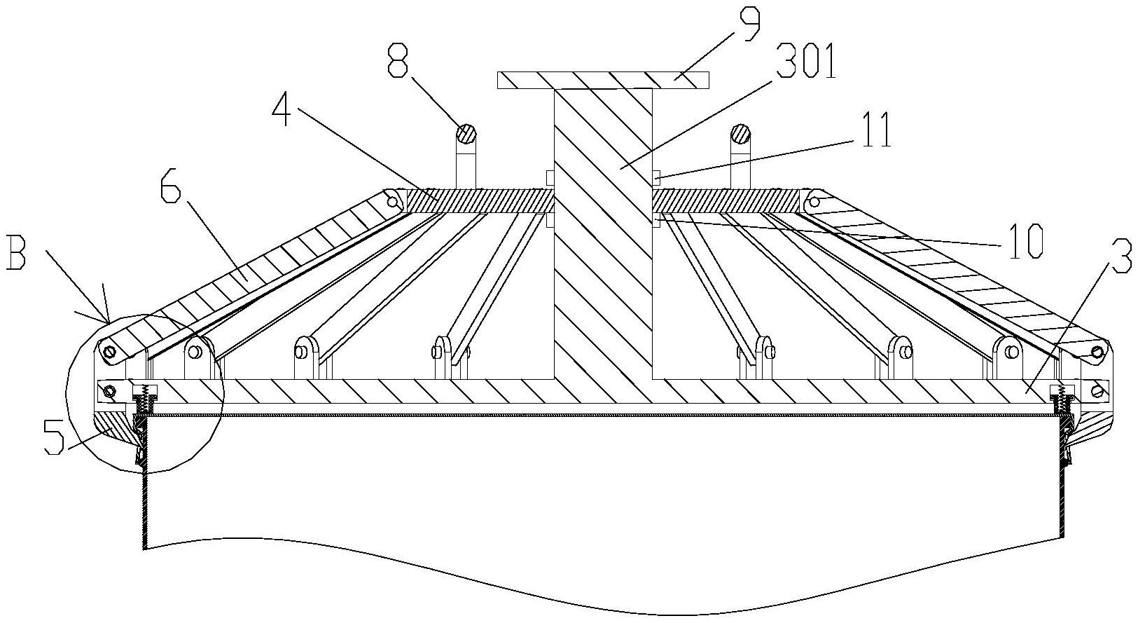 本实用新型公开了一种花篮桶开盖器,花篮桶包括花篮盖和桶体,花篮盖的边沿设置有多个垂直于盖底的变形片,每个变形片上设置有起盖孔;桶体的口沿平行设置有向外凸起的口沿凸筋和开盖凸筋;花篮桶开盖器包括:压盘、升降盘、撬杆和连杆;压盘的中心设置有向上的导向柱,所述导向柱上滑动套设升降盘;压盘的外侧壁径向均布数量与变形片数量相等的撬杆,每个撬杆的中部与压盘铰接;连杆的一端与撬杆的顶端铰接,另一端与升降盘铰接;压盘的下表面径向均布有多个弹簧销;撬杆的下端设置有用于起撬所述变形片的起撬钩。本实用新型花篮桶开盖器一次性打开所有变形片,提高了工作效率,花篮桶内的涂料可以完全倒出,桶体可以重复利用。