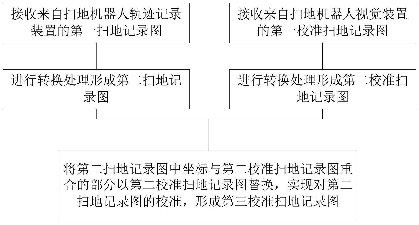本发明公开了一种扫地记录图的校准方法、扫地机器人及移动终端,扫地记录图的校准方法包括基本扫地记录图获取过程、校准扫地记录图获取过程和校正过程。利用来自扫地机器人视觉装置的校准扫地记录图对来自扫地机器人轨迹记录装置的基本扫地记录图进行校准,避免了因扫地机器人打滑或者碰到障碍物而造成的地图偏差,从而为后续扫地机器人精准控制创造了条件。由于第一扫地记录图和第一校准扫地记录图均进行了转换处理,形成的第二扫地记录图和第二校准扫地记录图分别小于第一扫地记录图和第一校准扫地记录图,这样就可以在扫地机器人的WiFi通讯模组上备份完整的第二扫地记录图和第二校准扫地记录图而无须对WiFi通讯模组的存储空间做太大的升级。