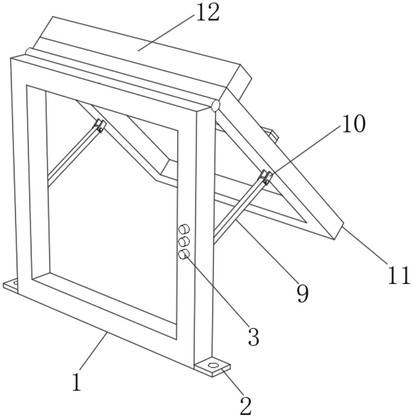 本实用新型涉及窗户辅助设备领域,公开了一种窗用辅助受力杆件,包括受力框架,所述受力框架的内部前后两侧均设置有安装腔,所述安装腔的顶部内壁上均固定连接有电机,所述电机的驱动端均固定连接在螺纹杆的顶端,所述螺纹杆的外径上均螺纹连接有移动板,所述移动板的右侧均固定连接在连接板的左侧,所述连接板的右侧凹槽内均转动连接有支撑杆,所述支撑杆远离连接板的一端均转动连接有转动板。本实用新型中,电机带动螺纹杆转动,螺纹杆带动移动板通过支撑杆和转动板带动安装框架进行转动,使得安装框架打开,可以控制安装框架打开的角度,便于根据需要打开窗户,使得窗户处于最佳的开口大小,有利于提升通风和透光效果。