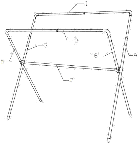 本实用新型涉及一种滚珠式X型伸缩晾衣架。它包括均为伸缩杆的第一横杆(1)、第二横杆(2)、第一立杆(3)、第二立杆(4)、第三立杆(5)、第四立杆(6)和连接杆(7),此伸缩杆包括外管(8)、内管(9)和U型弹片(10),所述内管(9)的一端位于外管(8)内,U型弹片(10)设置在内管(9)内,U型弹片(10)的一边与内管(9)的内壁固定,另一边上设置有滚珠(11),此滚珠(11)伸出内管(9)的壁面,所述外管(8)上开有若干与滚珠(11)配合的孔(12)。本实用新型一种滚珠式X型伸缩晾衣架,伸缩功能只需按住滚珠同时移动内管至所需长度位置,松开滚珠使其卡住孔,操作简单方便,适用与所有人群。