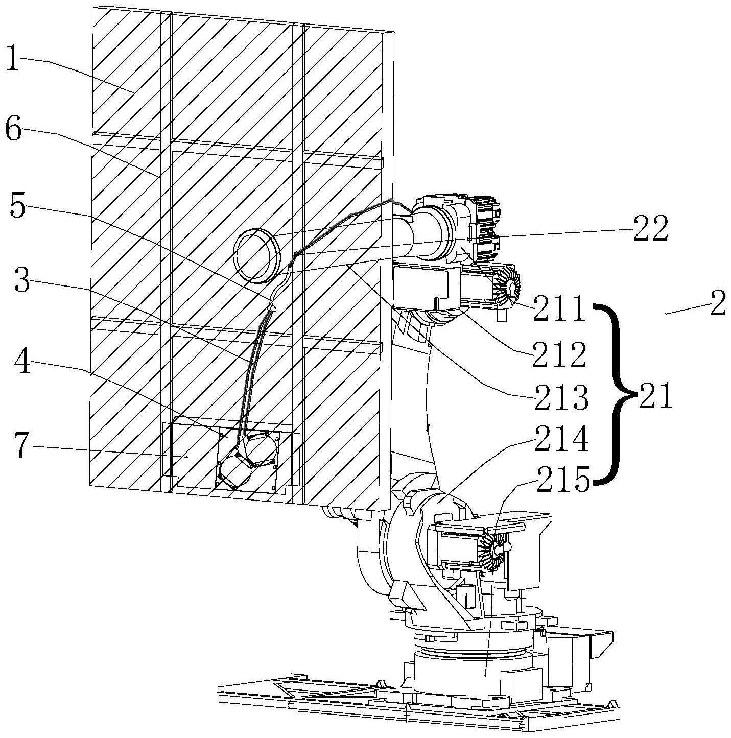 本实用新型提供了一种适用于万向机械臂旋转屏的外走线结构,通过在旋转屏背面靠近边缘的位置设置一紧线盒,并且设置一导线管的方式,避免了旋转屏在自转过程中线缆的缠绕,同时解决了现有的万向机械臂旋转屏在进行任意旋转、翻转、移动过程中存在的线束缠绕、信号不良、防水性差、灵活性不佳的问题,本实用新型无需提前在机械臂中设计线缆容纳空间,节省了机械臂的空间,同时提升了旋转屏旋转过程中的灵活性,并简化了机械臂的设计过程。