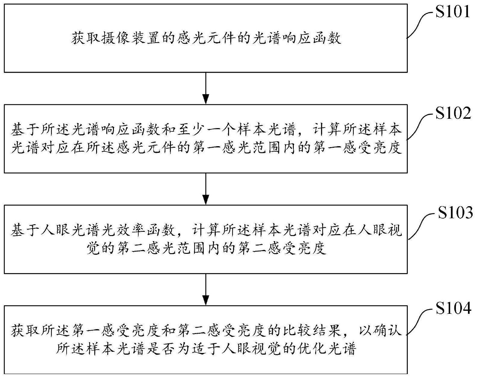 本申请提供灯具光谱确定、获取方法及相关设备和介质,所述灯具用于摄像装置的补光;所述灯具的光谱确定方法包括:获取摄像装置的感光元件的光谱响应函数;基于所述光谱响应函数和至少一个样本光谱,计算所述样本光谱对应在所述感光元件的第一感光范围内的第一感受亮度;基于人眼光谱光效率函数,计算所述样本光谱对应在人眼视觉的第二感光范围内的第二感受亮度;获取所述第一感受亮度和第二感受亮度的比较结果,以确认所述样本光谱是否为适于人眼视觉的优化光谱。通过所述灯具的光谱确定方法以获得目标光谱在摄像装置视觉和人眼视觉下感受亮度的差异,以能在配置补光的灯具时,在满足曝光量的同时,降低人眼受到灯具亮度的刺激。