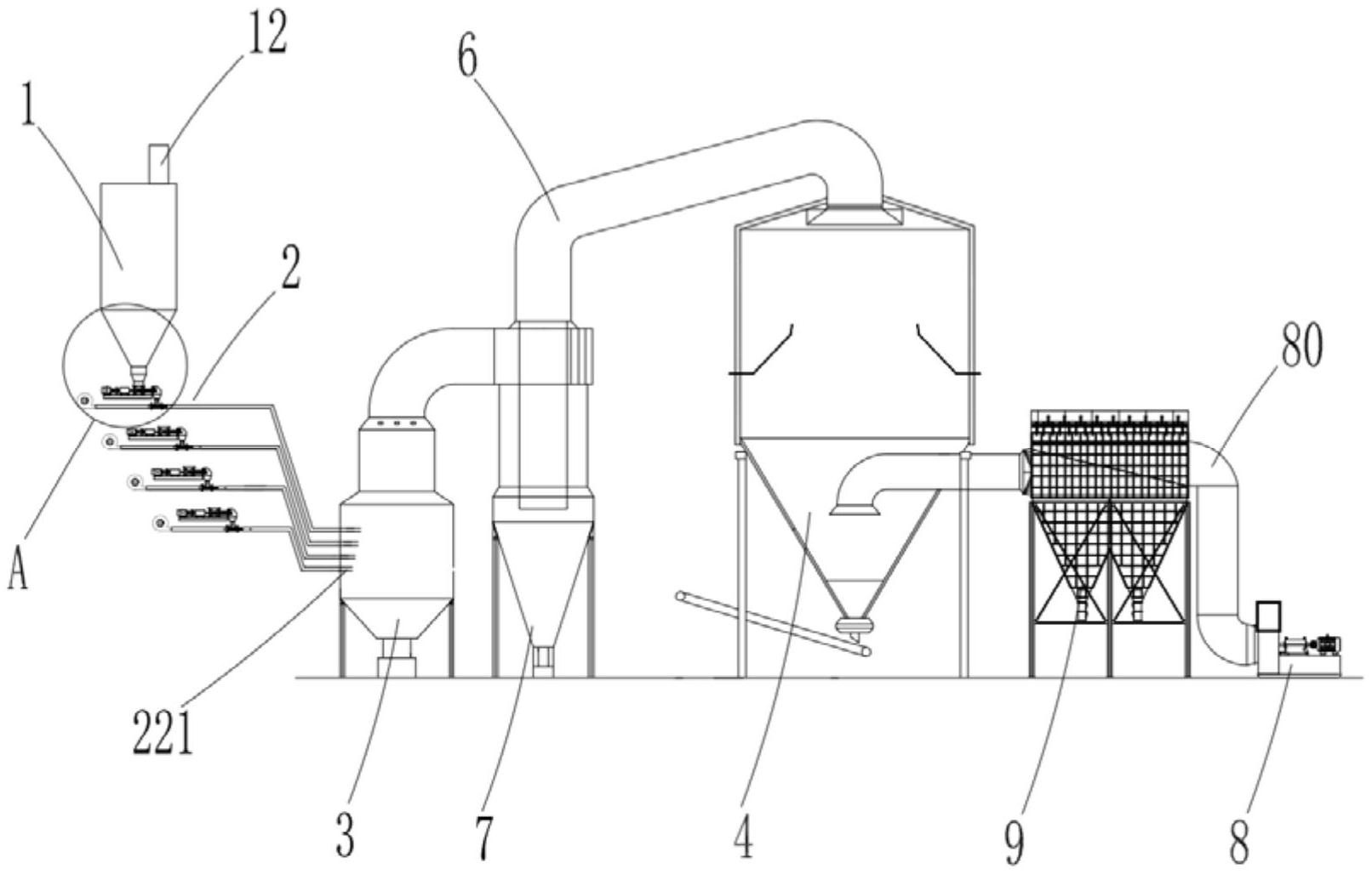 本实用新型公开了一种煤粉直烧系统的微煤负压输送节能燃烧装置,包括煤粉仓、负压输送装置、热风炉和喷雾塔,所述煤粉仓的底部设有出料口,所述出料口底部设置有送料器,所述负压输送装置包括罗茨风机和输送管道,所述罗茨风机连接所述输送管道的一端,所述输送管道的另一端设有出料端,所述出料端连接所述热风炉,所述输送管道的壁面开设有进料端,所述送料器的送料端与进料端连接,通过送料器将煤粉仓内的陶瓷粉料送到负压输送装置的输送管道内,利用罗茨风机在输送管道内形成负压气流,陶瓷粉料随负压气流经输送管道的出料端进入热风炉,整个过程中由于陶瓷粉料始终处于封闭的管道中因而不会产生粉尘飞扬污染环境,环保节能。