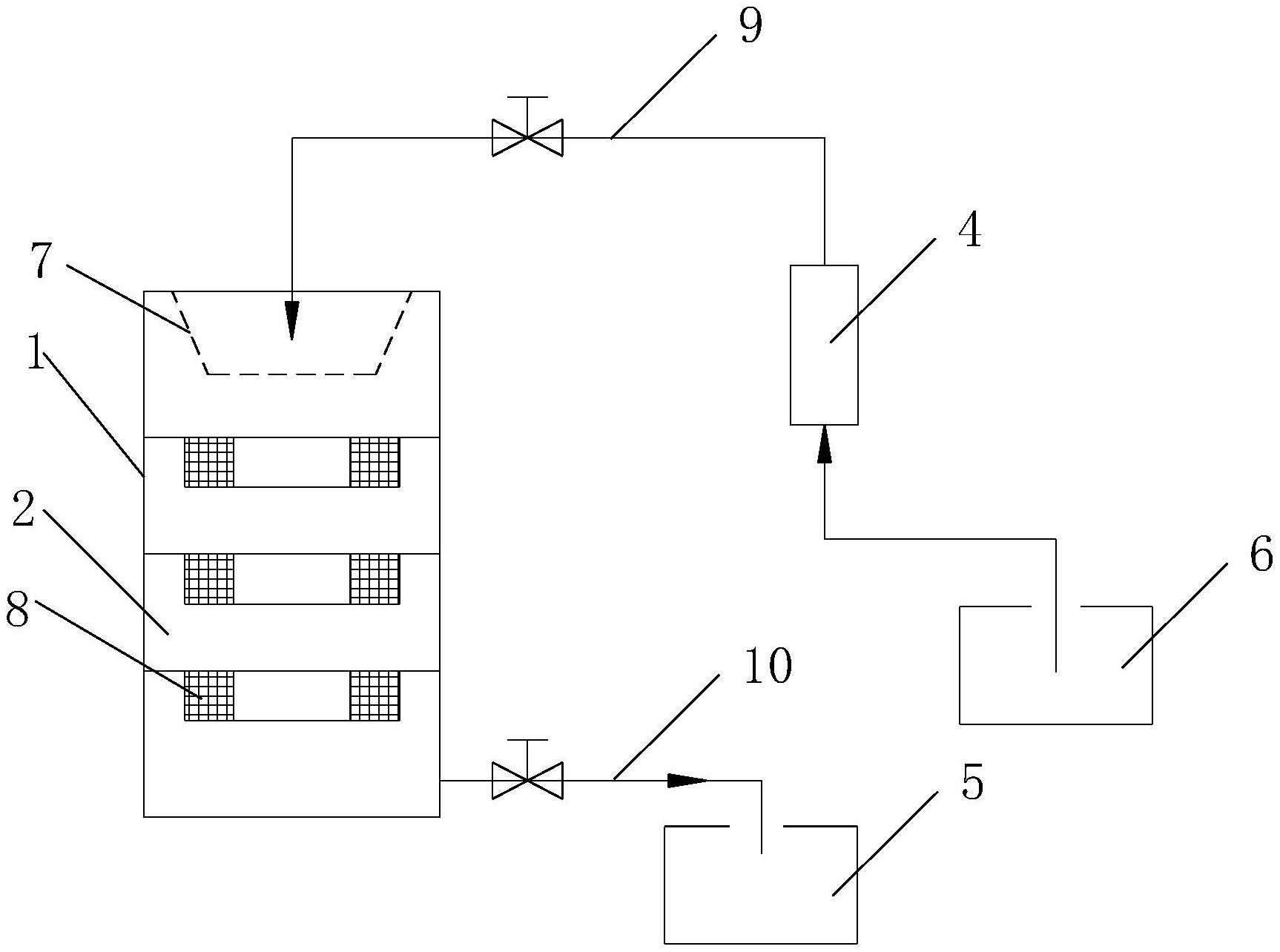本实用新型涉及一种废尿素水过滤回收系统,包括罐体、滤芯、尿素储存桶、废尿素水收集桶,罐体内由上至下设置四个相互连通的腔体,顶部腔体内设有滤袋,其余腔体内设有滤芯,罐体底部连接有出口管道,出口管道通过阀门与尿素储存桶连接,废尿素水收集桶通过输送管道与罐体顶部连接,输送管道上连接有气动泵。优点是:结构合理,能够对废尿素水过滤回收,使废尿素水得以回收使用。废尿素水收集桶中的废尿素水通过气动泵抽到罐体内,经过四次过滤后,直接收集到尿素储存桶回收使用。罐体上设置换芯门,方便滤芯更换,不影响废尿素水的过滤。