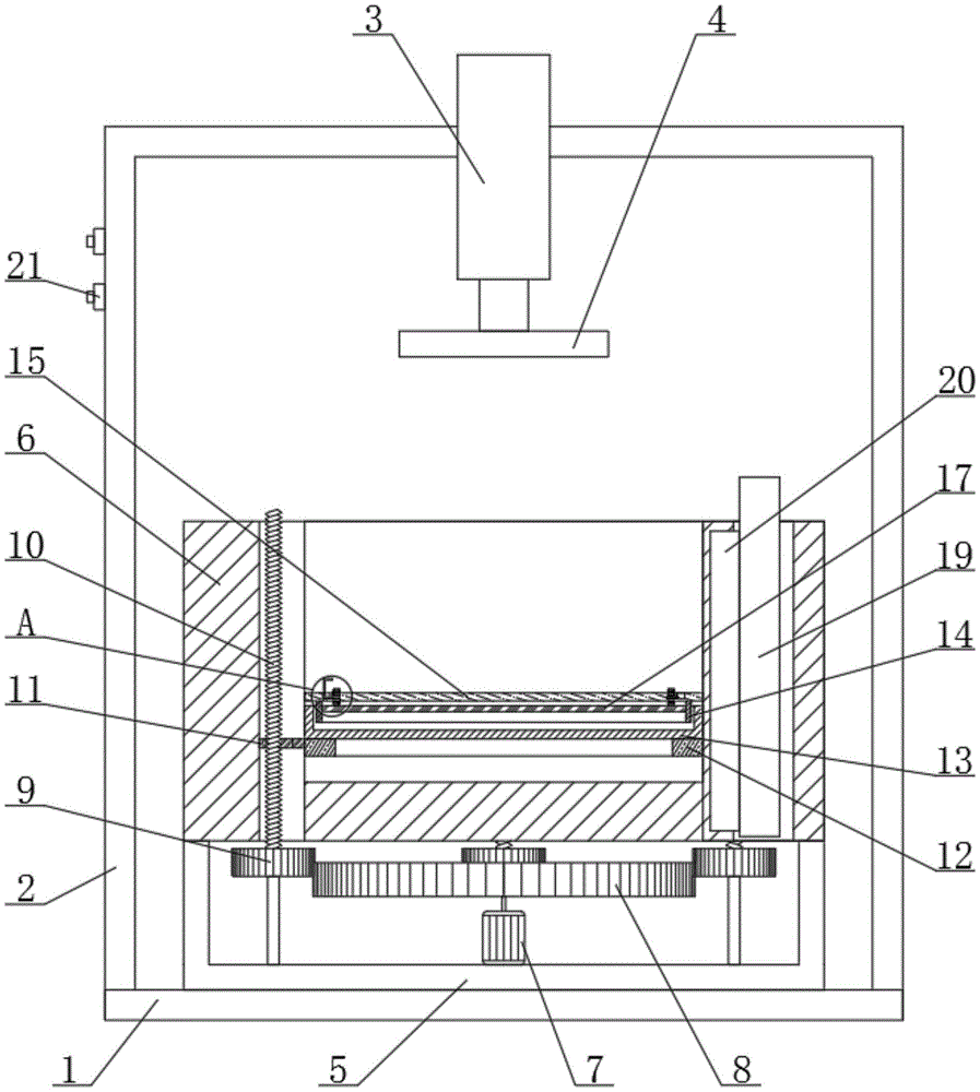 本实用新型涉及茶干压模装置技术领域,尤其为一种茶干用压模装置,包括工作台,所述工作台顶端固定连接有支架,两个所述支架之间固定连接有液压杆,所述液压杆主轴末端固定连接有压盘,所述工作台顶端固定连接有底座,所述底座顶端固定连接有外壳,所述底座顶端固定连接有电机,所述电机主轴末端固定连接有主动轮,所述主动轮外侧啮合有从动轮,所述从动轮顶端固定连接有螺纹杆,所述螺纹杆外侧螺旋连接有连接块,所述连接块一侧固定连接有托盘,位于左端的所述液压杆左侧固定连接有按钮,本实用新型中,通过设置的主动轮、从动轮、螺纹杆和连接块,降低人工成本,省时省力,便于放置料盘和物料,提高装置使用的便捷性,操作简单。