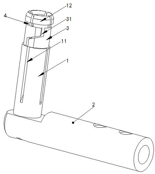 本实用新型公开了一种自带锁紧功能的焊接铜头,包括:铜头本体及铜头接线柱,铜头本体与铜头接线柱可拆卸式连接,铜头本体为空心圆柱开口结构,铜头本体上沿轴向间隔开设有多条水平凹槽,凹槽自铜头本体的开口端延伸至接近铜头本体的末端,铜头本体上端沿轴向铣出卡槽,卡槽内套设有弹性卡扣件,弹性卡扣件上开设有纵向截断整个弹性卡扣件的缺口。本实用新型的焊接铜头,通过弹簧钢卡扣或卡箍实现焊接铜头的伸缩的功能,大大提升铜头的使用寿命,并保证每次承插入位都是接触良好的,也大大提升了焊接成功率。