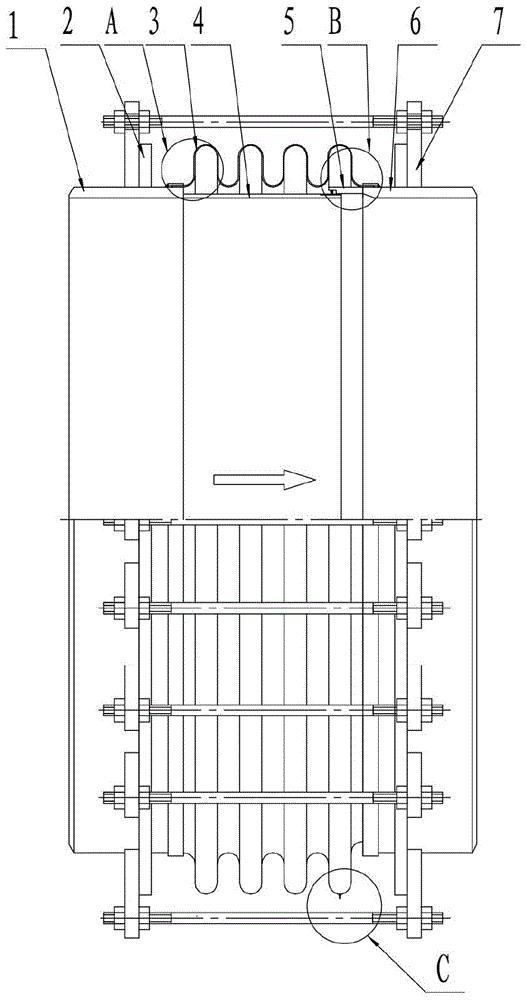 一种耐强气流冲刷的金属膨胀节,包括波纹管、进口接管、出口接管和导流筒,波纹管两端分别连接进口接管、出口接管,所述进口接管、出口接管同内径,导流筒包括进口导流筒和出口导流筒,进口导流筒的内径与进口接管的内径相同,进口导流筒与进口接管对合焊接;出口导流筒的内径大于出口接管内径及进口导流筒的外径,出口导流筒与出口接管对合焊接,出口导流筒套装与进口导流筒末端。本实用新型对常规导流筒结构进行了改进,设置进口导流筒和出口导流筒,进口导流筒的内径与进口接管内径等直径,两者共面有效提高导流筒的通流面积,大大减小了高强度通流介质对导流筒的冲刷,在保持金属膨胀节良好补偿性能的同时,提高金属膨胀节使用安全性和寿命。