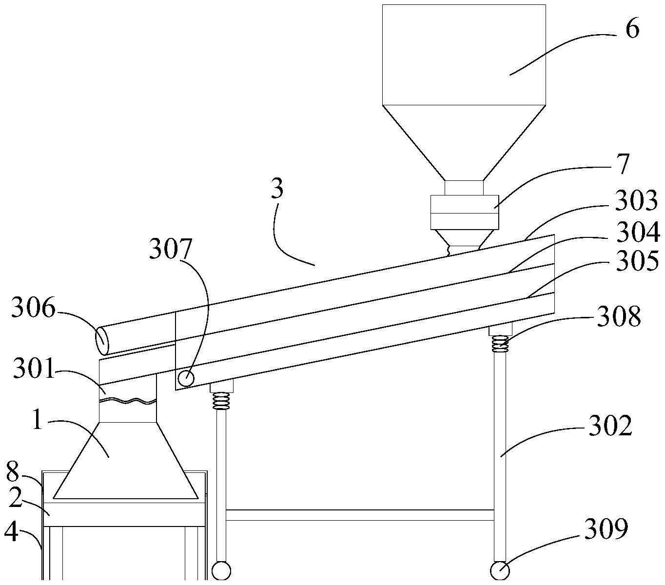 本实用新型提供了一种保护渣布料降温装置,属于保护渣制备方法技术领域。一种保护渣布料降温装置,包括布料器以及位于所述布料器下方的皮带输送机,所述布料器包括进口部以及与所述进口部连接的分散腔,所述进口部与振动筛的合格品出料口软连接,所述分散腔相对于所述进口部的中心轴线倾斜设置,所述分散腔的下部向两侧扩,且开口朝向所述皮带输送机的输送带,所述皮带输送机设置在密闭箱体内,所述密闭箱体的侧面对应所述输送带接入冷空气,所述密闭箱体的顶部设置出风口。本实用新型通过上述技术方案以使高温保护渣得以有效降温。