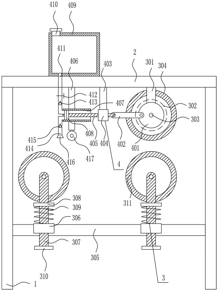 本发明涉及一种工程机械装置,尤其涉及一种间隔式木板涂胶水装置。本发明要解决的技术问题是提供一种能够自动对木板表面进行喷涂、喷涂均匀、耗费时间短的间隔式木板涂胶水装置。为了解决上述技术问题,本发明提供了这样一种间隔式木板涂胶水装置,包括有支腿等;左右侧支腿顶部设有连接板,连接板上安装有传送机构,连接板顶部安装有涂胶水机构。本发明通过传送机构和涂胶水机构的相互配合,对木板表面进行胶水的喷涂,同时利用挤压机构的优化,达到了能够自动对木板表面进行喷涂、喷涂均匀、耗费时间短的效果。