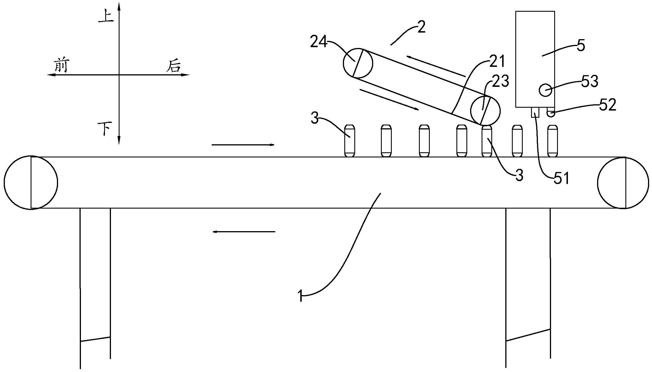 本实用新型公开了一种自动压盖机,物料输送装置用于从前往后输送包装瓶;皮带传送装置设置于物料输送装置的顶部,并沿前往后向下倾斜,第一辊轴的底端低于第二辊轴,第一辊轴和皮带传送装置之间形成挤压空间,传送带于挤压空间处具有向后的线速度,包装瓶经过挤压空间时,传送带能够向下挤压瓶盖,以使瓶盖贴合于瓶身。该技术方案利用皮带传送装置和传送带在挤压空间处同时给予包装瓶向后输送的动力,使得包装瓶稳步向后输送的同时实现封盖操作,以使瓶盖贴合于瓶身,而无需工作人员手动按压瓶盖,操作省力,且在运输的同时即可对包装瓶进行封盖,封盖效率极高,生产效率提高。